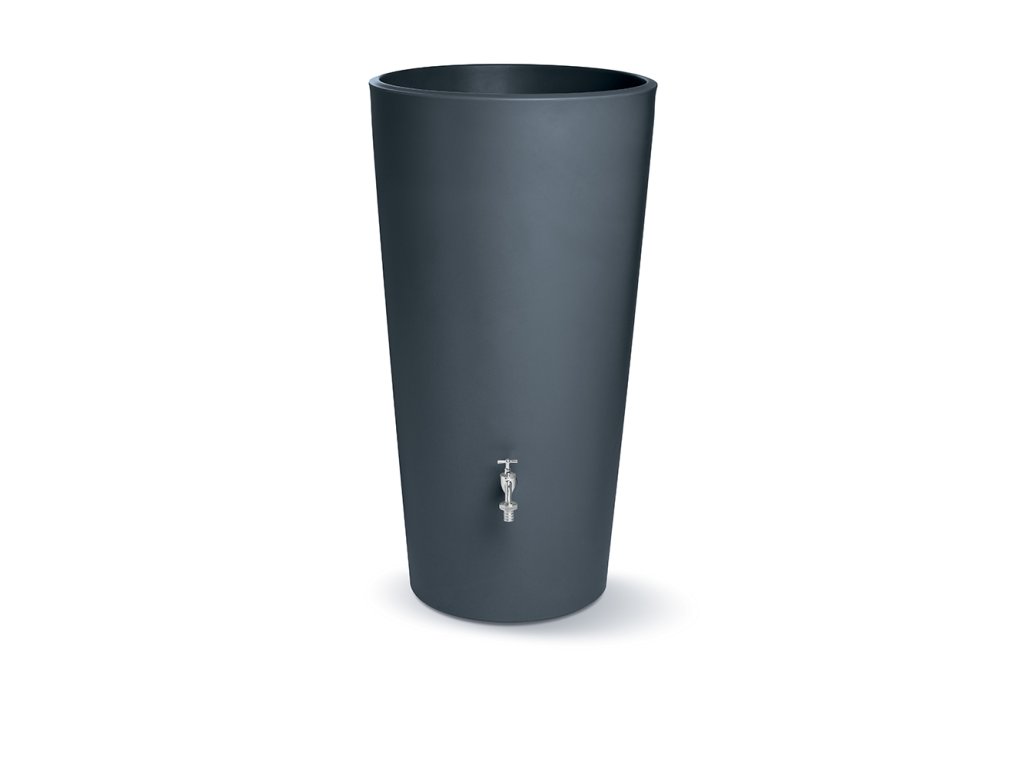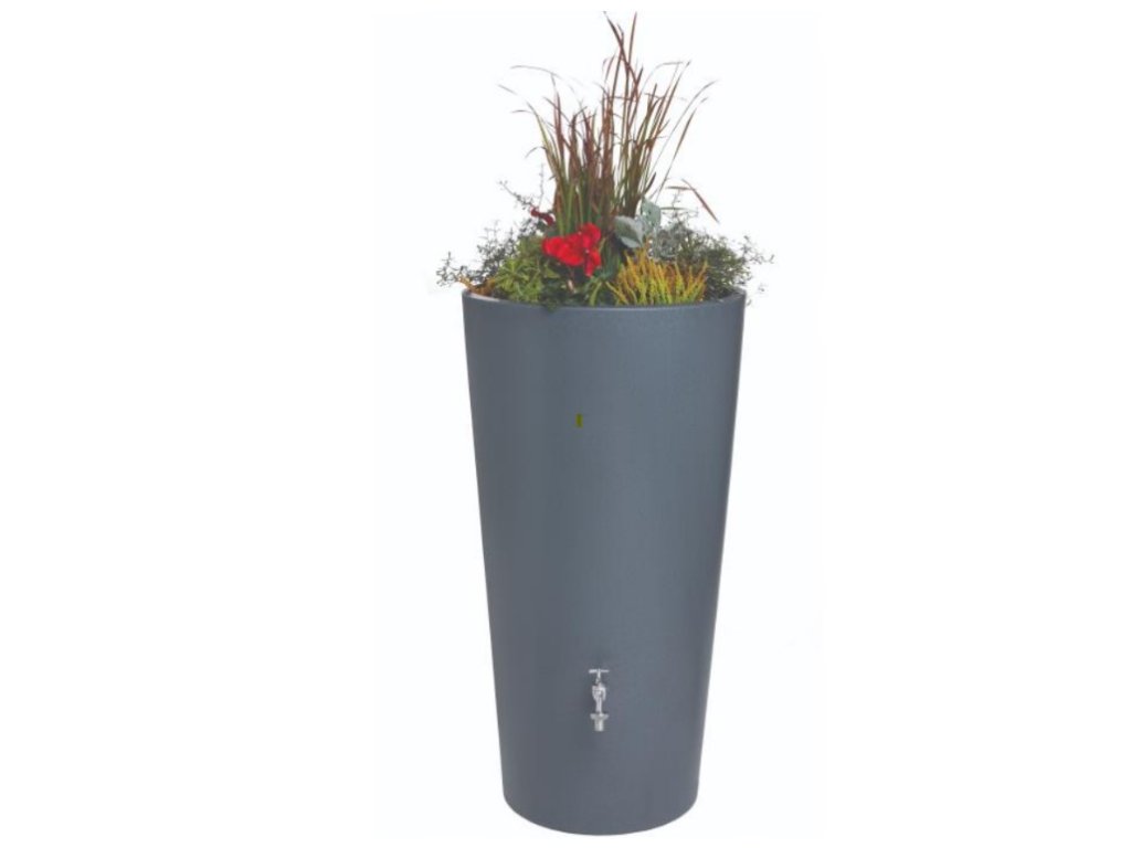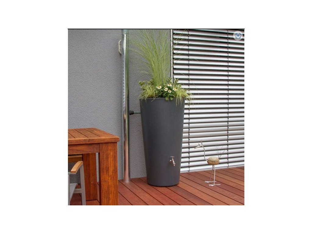 Moderní nádrž na dešťovou vodu Rainbowl Flower ve tvaru vázy je vyrobena z kvalitního plastu, který je odolný vůči povětrnostním vlivům. Největší předností této nádrže na vodu je její elegantní provedení, použité kvalitní materiály a především její praktičnost. Nádrž je ve své spodní části vybavena dvěma otvory s 3/4" mosazným závitem pro výpust vody. Jeden je určen pro napojení kohoutku ITAP, ten kousek od země poté na napojení hadice na vodu, nebo pro úplné vypuštění nádrže. Konstrukčně je tento typ sudu tzv. foukán, aby byl na rovném povrchu dobře stabilní a tudíž není potřeba podstavce. Povrchová úprava připomíná tmavě šedý beton, takže se snadno přizpůsobí fasádám moderních domů. V horní části má trvale integrovanou výsadbovou komoru, do které můžete zasadit květiny podle ročního období a vytvořit tak z nádoby záhon.
