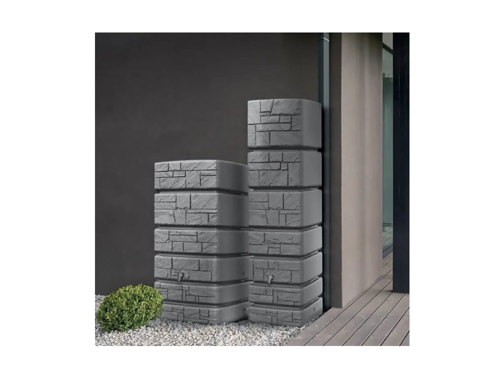 Moderní nádrž na dešťovou vodu Tower Stone je dekorativní nádrž, jejíž přední strana je zdobena imitací břidlicového obkladu. Nádrž je vyrobena z kvalitního plastu, který je odolný vůči povětrnostním vlivům, nekoroduje a nevybledne. Nádrž má v horní části otvor o průměru 20 cm s víkem. V tomto otvoru můžete použít zahradní čerpadlo. Okap s nádrží lze jednoduše propojit předpřipravenými plochami pomocí spojovacího systému Waterform Icanset, který zakoupíte v našem e-shopu. V přední části je sud ve výšce 38 cm nad zemí osazen otvory s 3/4" závitem pro napojení kohoutku ITAP(není součástí balení). Nádrž má také dva boční odtoky kousek od země pro napojení hadice na vodu, nebo pro úplné vypuštění nádrže. Konstrukčně je tento typ sudu tzv. foukán, aby byl na rovném povrchu dobře stabilní a tudíž není potřeba podstavce. Kamenný vzhled se skvěle hodí do moderních interiérů a zahrad v souladu s trendy v současné architektuře.