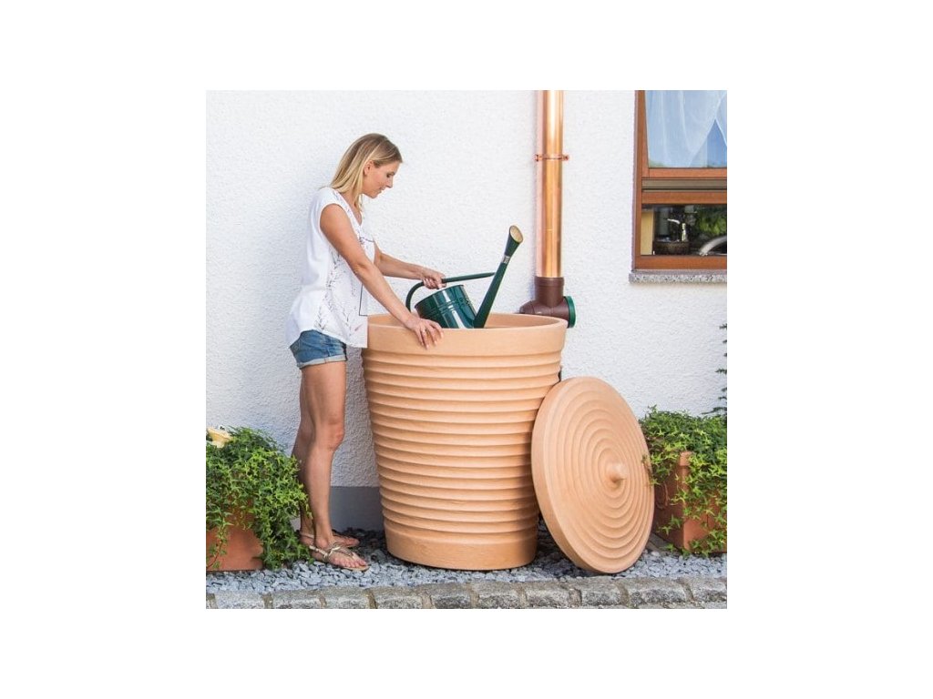 Dekorativní sud na dešťovou vodu TRENTINO terakota o objemu 275 litrů vypadá jako velká terakotová nádoba, a proto se hodí zejména do zahrad ve středomořském stylu, skalnatých zahrad, vypadá skvěle vedle cihlové fasády a ve společnosti keramických květináčů. Díky dešťové vodě je zalévání zahrady mnohem ekonomičtější a pro rostliny, jak okrasné a užitkové i prospěšnější. Díky obsahu dusíku ve vodě se tento prvek dostává k rostlinám pro ně přirozenou formou. Dešťová voda neobsahuje chlór, žádné soli vápníku a hořčíku, což jsou chemické látky, které způsobují trvalou nebo dočasnou tvrdost vody. I proto je vhodná pro kapkové závlahy, které se nezanášejí a lépe fungují.