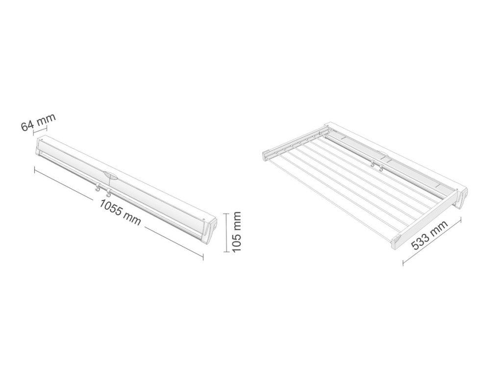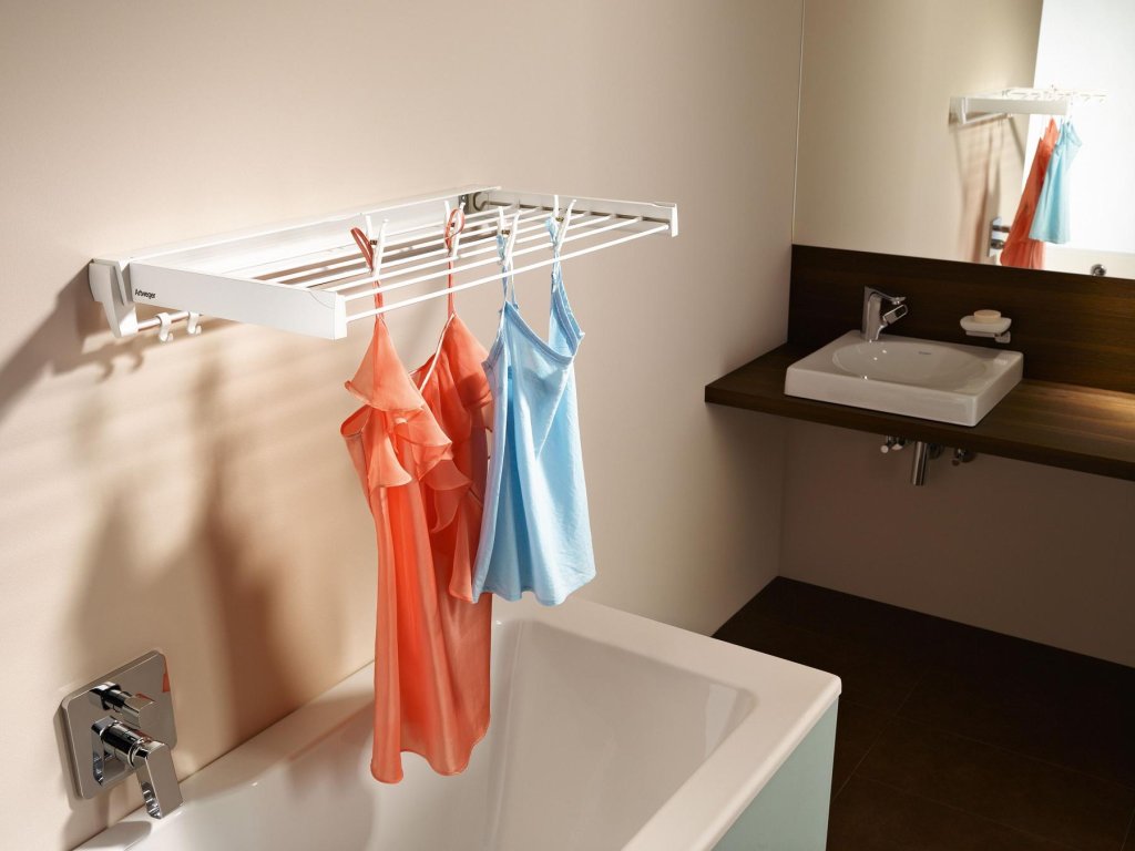 Rozložení sušáku je velice jednoduché. Sklopením ramen je možné sušák uzavřít do pouzdra na zdi.