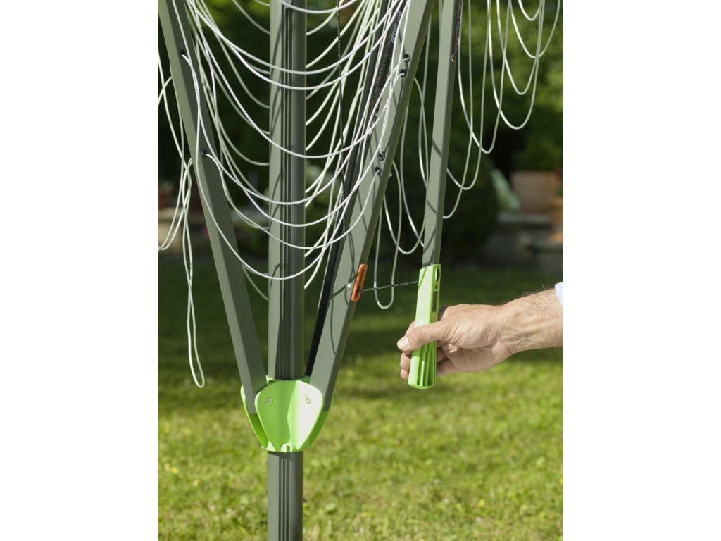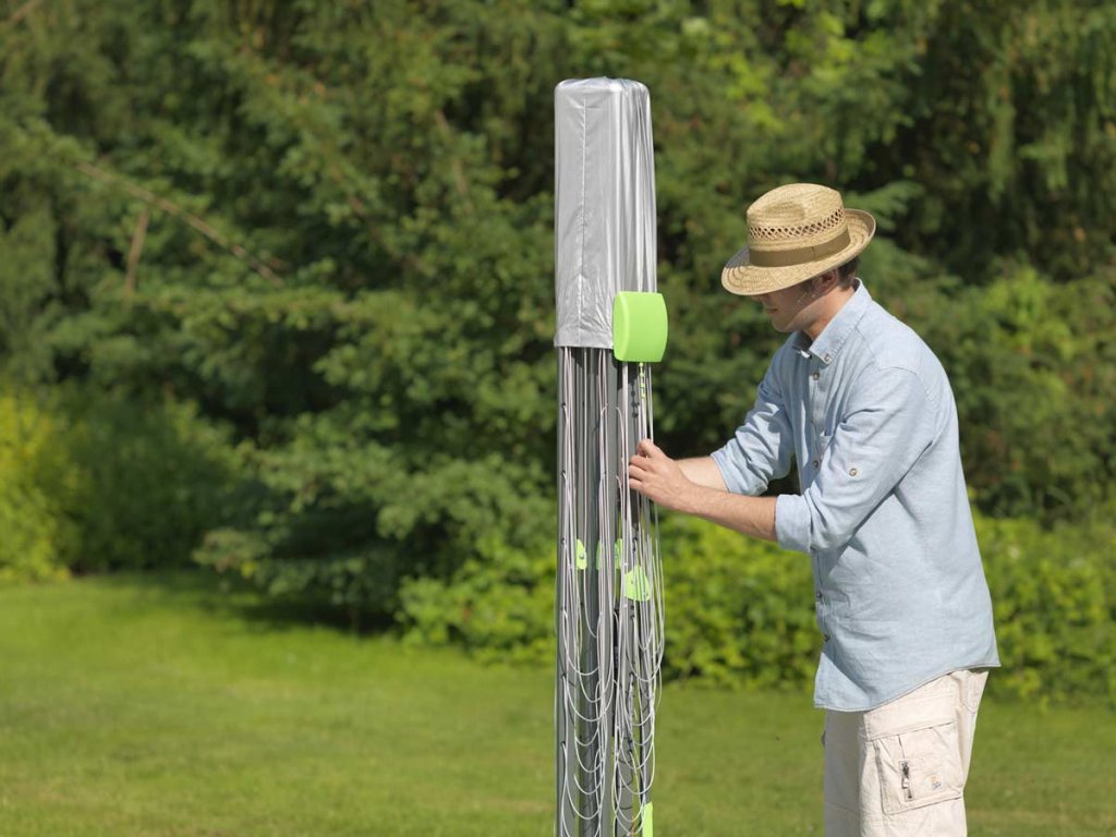 Montáž sušáku Juwel je naprosto jednoduchá a není potřeba nic betonovat. Ukotvení do země je řešeno pomocí plastového zemního šroubu, který se zašroubuje do země a do něj se zasune nosná tyč. Velkou výhodou zemního šroubu je, že sušák můžete umístit kdekoliv na zahradě, kde je možné šroub zavrtat pevně do země.
