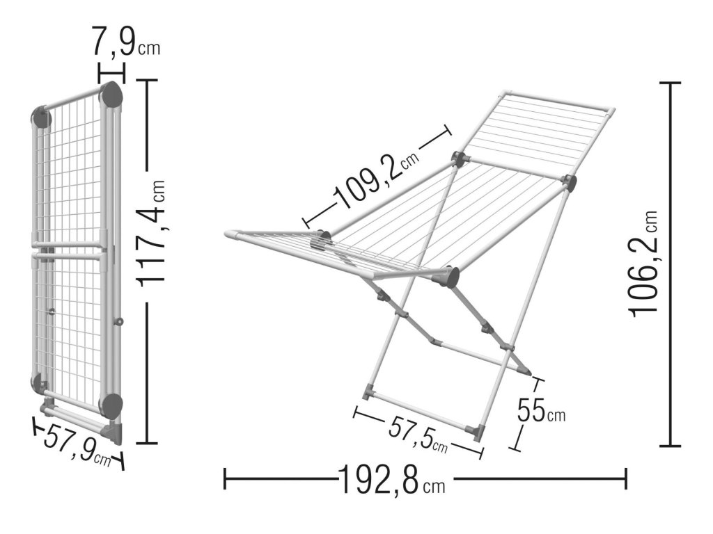 Rozložení a složení sušáku je velice jednoduché. Rozměry jsou 188,5 x 58,5 x 106 cm.
