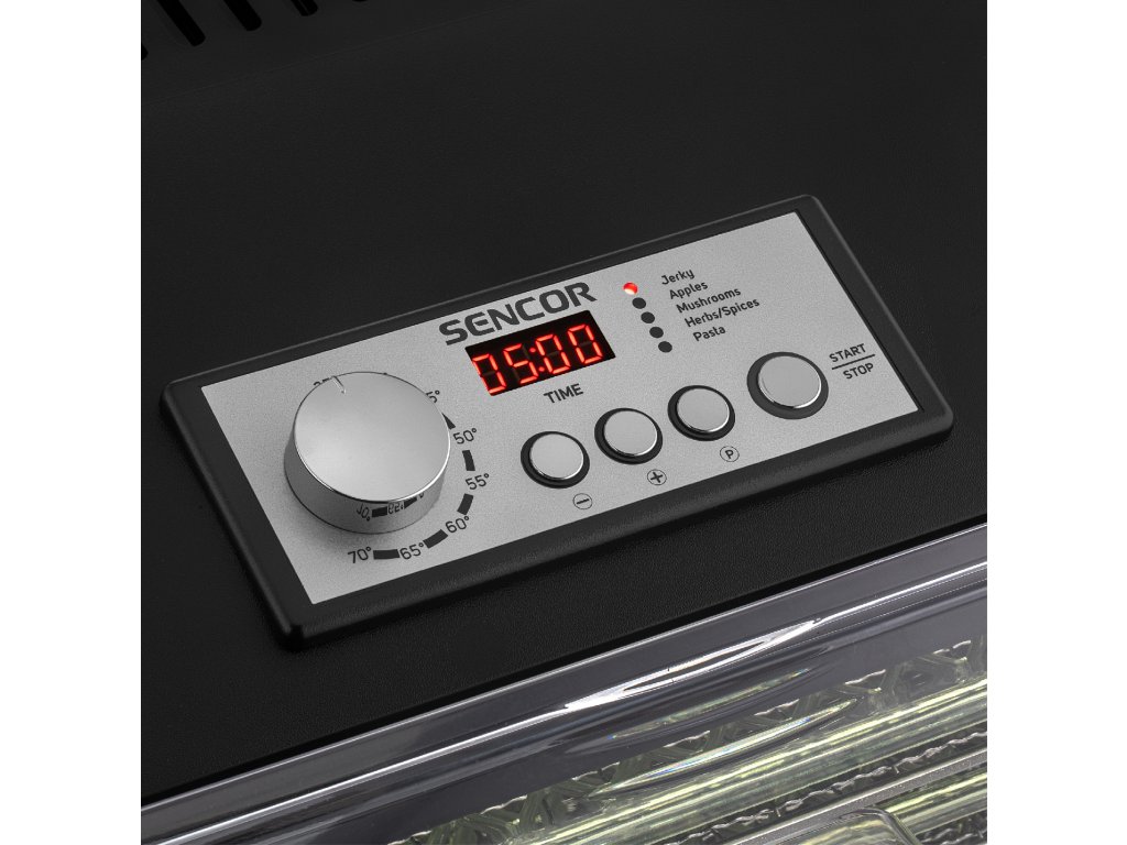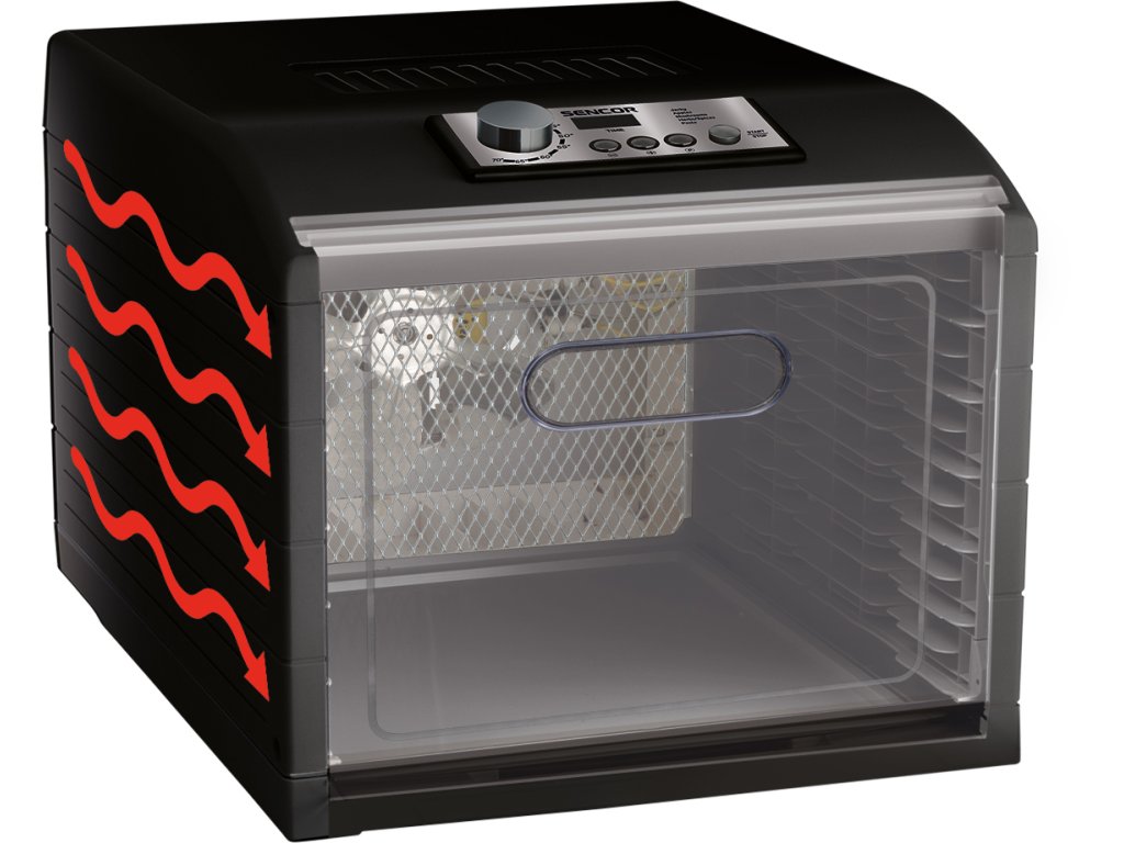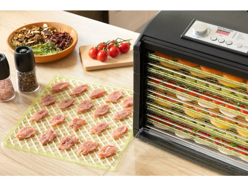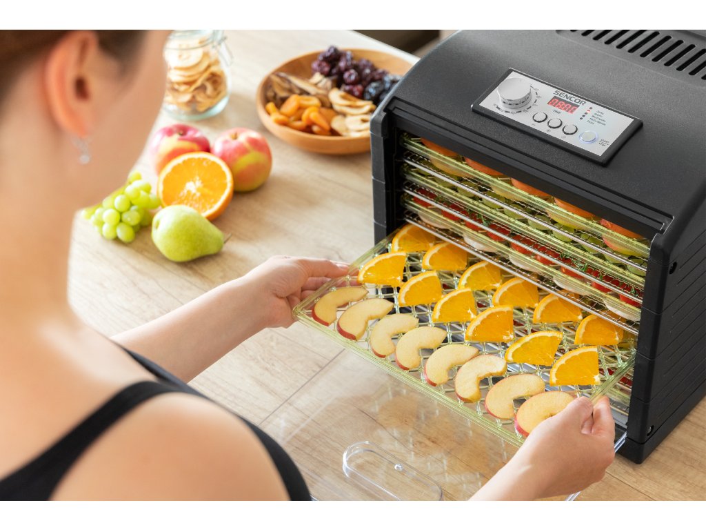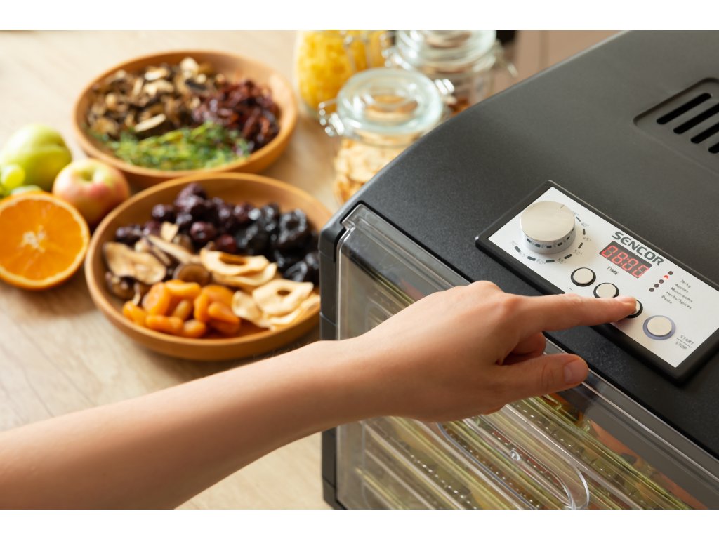Sušička potravin SENCOR SFD 6601BK s příkonem 500 W, 12 tepelně odolnými podnosy a sušící plochou 1,18 m2 (o 65 % větší než běžná sušička s průměrem 32 cm). Usušte si kvalitní potraviny bez zbytečně přidaných konzervantů a cukrů. Stačí jen nakrájet vybrané suroviny na plátky a naskládat je vedle sebe. Po nastavení času se automaticky spustí odpočítávání.Sušička ovoce 5 automatických programů pro - Sušené maso - Jablka - Houby - Bylinky / Koření - Těstoviny. Jakmile je dosušeno, sušička se sama automaticky vypne. Díky LED diodám a časovači budete mít celý proces pod dohledem.Regulace teploty 35-70 °C umožňuje zachovat maximální množství přírodních látek. Sušička má dvanáct plátů, na jeden plát se vejde pět set gramů. Design mřížky sušících podnosů zabraňuje vzniku plísní a optimalizuje proudění vzduchu.