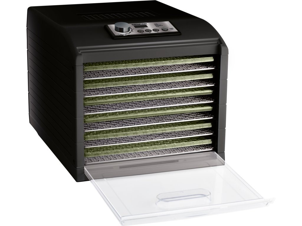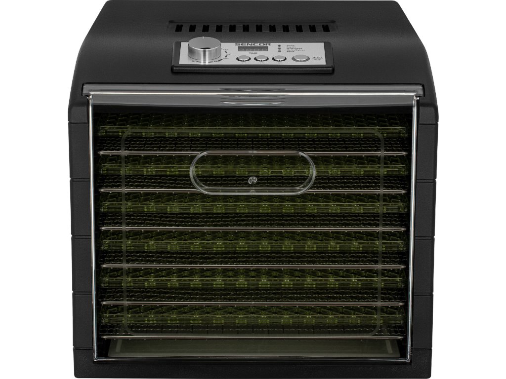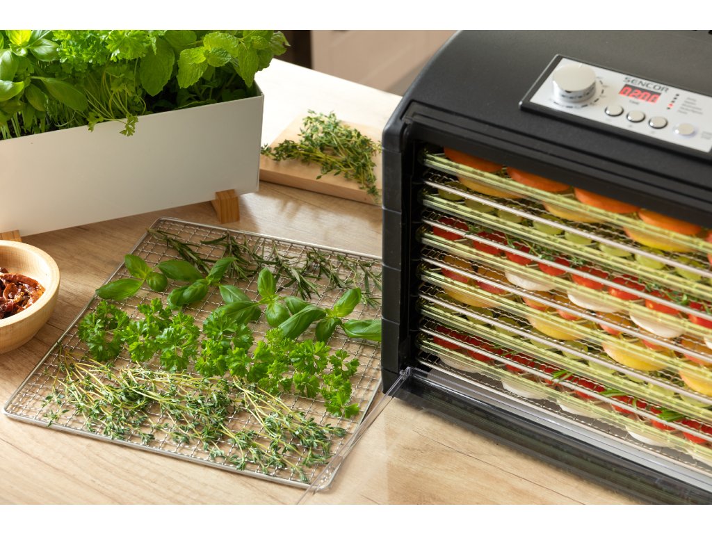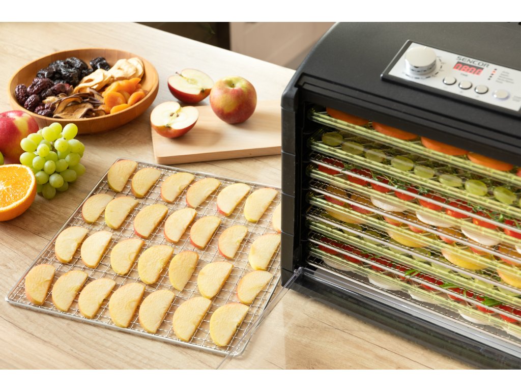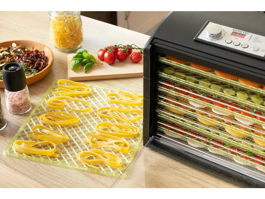 Sušička potravin SENCOR SFD 6601BK s příkonem 500 W, 12 tepelně odolnými podnosy a sušící plochou 1,18 m2 (o 65 % větší než běžná sušička s průměrem 32 cm). Usušte si kvalitní potraviny bez zbytečně přidaných konzervantů a cukrů. Stačí jen nakrájet vybrané suroviny na plátky a naskládat je vedle sebe. Po nastavení času se automaticky spustí odpočítávání.Sušička ovoce 5 automatických programů pro - Sušené maso - Jablka - Houby - Bylinky / Koření - Těstoviny. Jakmile je dosušeno, sušička se sama automaticky vypne. Díky LED diodám a časovači budete mít celý proces pod dohledem.Regulace teploty 35-70 °C umožňuje zachovat maximální množství přírodních látek. Sušička má dvanáct plátů, na jeden plát se vejde pět set gramů. Design mřížky sušících podnosů zabraňuje vzniku plísní a optimalizuje proudění vzduchu.