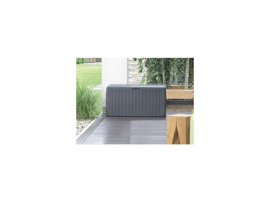 Box chrání uschované předměty před případným deštěm. Lehce v něm uschováte polštáře ze zahradního nábytku, deky, zahradní potřeby, menší nábytek nebo hračky pro děti. Lze ho zabezpečit i visacím zámkem a zamknout cennější věci uvnitř.