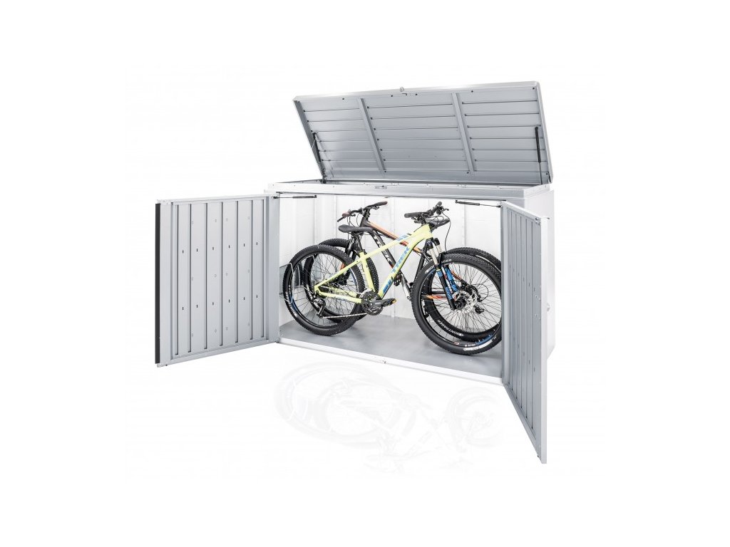 Box je absolutně odolný proti dešti, s integrovanou ventilací, uzamykatelný. Dokoupením držáku jízdních kol v nabídce volitelného příslušenství získáte bezpečnou garáž pro svá kola.