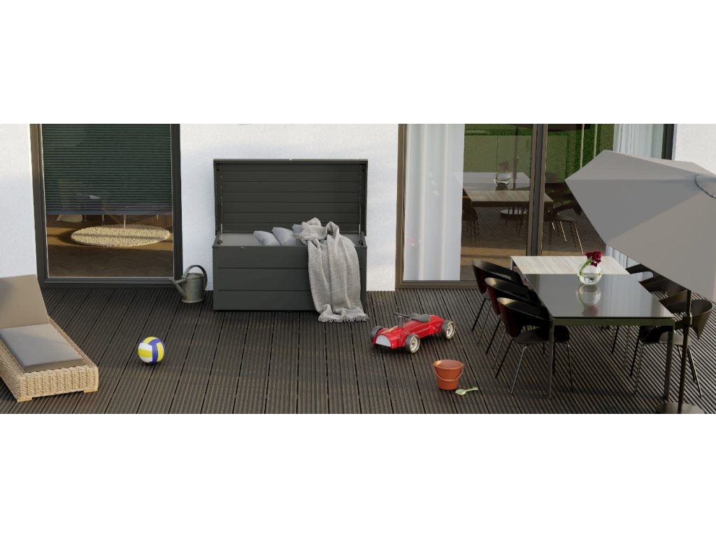 Box můžete nechat po celý rok venku, je voděodolný, s neviditelnou integrovanou ventilací. Díky tomu uskladněné věci nepodléhají plísním. Můžete v nich skladovat i polstry a potahový materiál pro zahradní nábytek. Box můžete umístit na balkon, terasu, k zahradnímu bazénu, do zahradního domku nebo garáže.