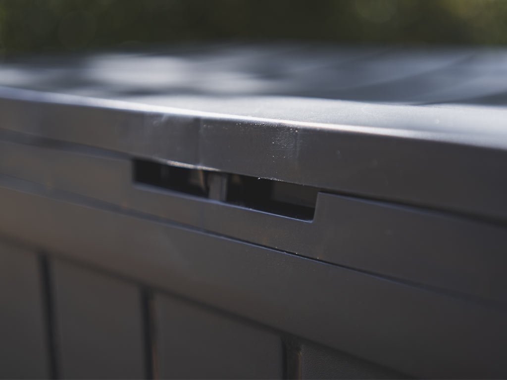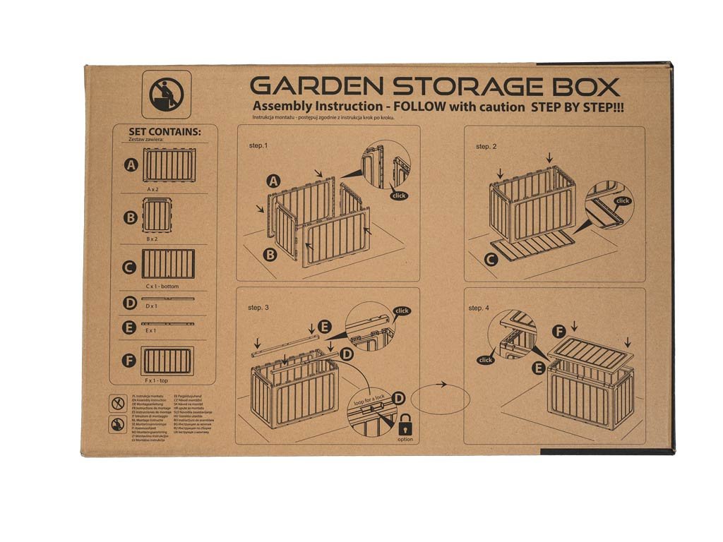 Box chrání uschované předměty před případným deštěm. Lehce v něm uschováte polštáře ze zahradního nábytku, deky, zahradní potřeby, menší nábytek nebo hračky pro děti. Lze ho zabezpečit i visacím zámkem a zamknout cennější věci uvnitř.