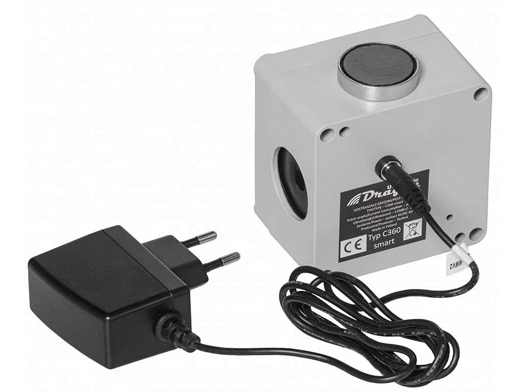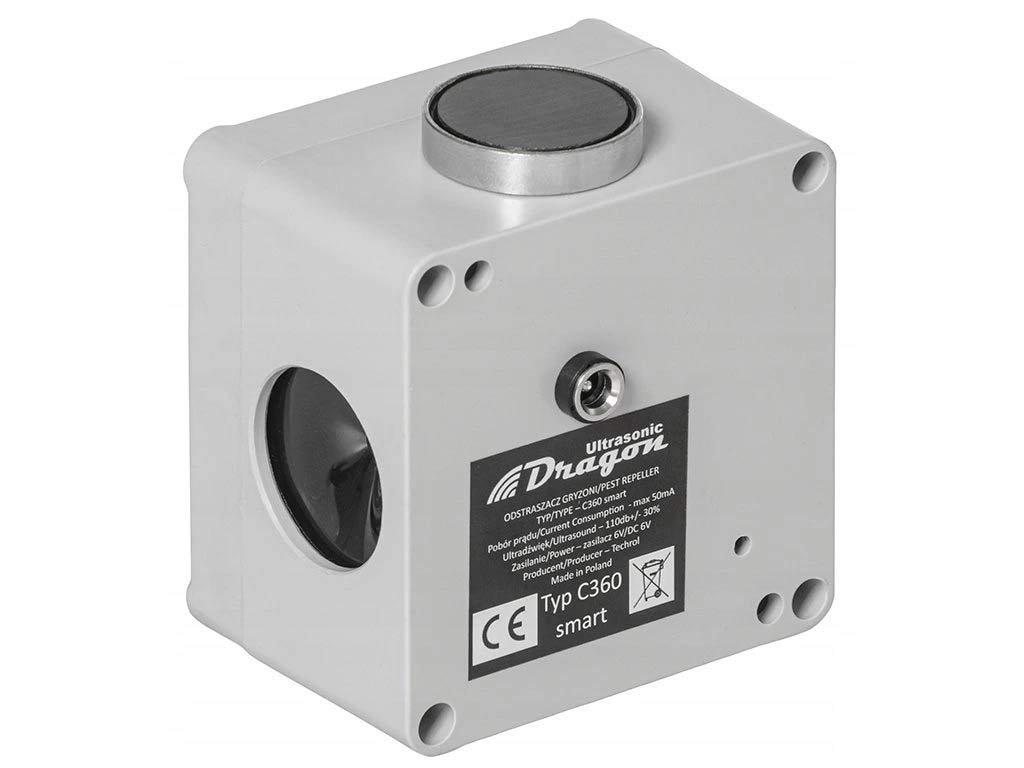 Moderní a výkonný ultrazvukový plašič DRAGON ULTRASONIC C360 SMART představuje efektivní ochranu proti kunám a hlodavcům v interiéru i exteriéru. Je vybaven vodotěsným krytem, třemi membránovými reproduktory a má dosah až 1500 m². Ultrazvukový signál s automatickou změnou frekvence působí odpuzujícím účinkem a zabraňuje tomu, aby si škůdci na zvuk zvykli. Montáž je díky silnému magnetickému držáku velmi jednoduchá a napájení zajišťuje 6V adaptér, který je součástí balení. Rozměry zařízení jsou kompaktní – 85 x 85 x 55 mm.