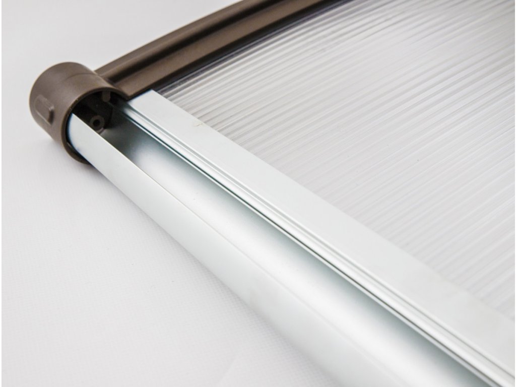 Stříšku nabízíme v rozměrech - šířka 1500 mm x hloubka 820 mm a barevné kombinaci - bílé profily + zasklení čirým dutinkovým polykarbonátem 6 mm.
