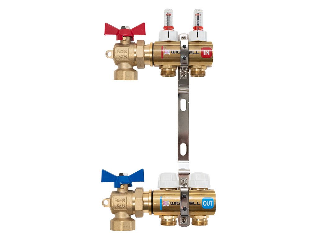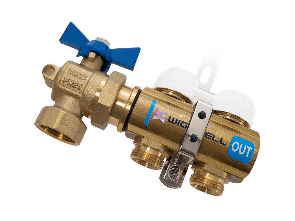 Kulový ventil modrý mosazný 1" přímý se šroubením k rozdělovači. Balení obsahuje 2...