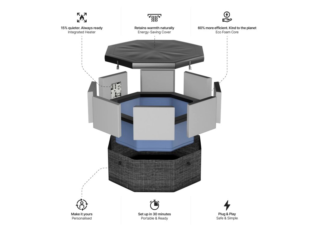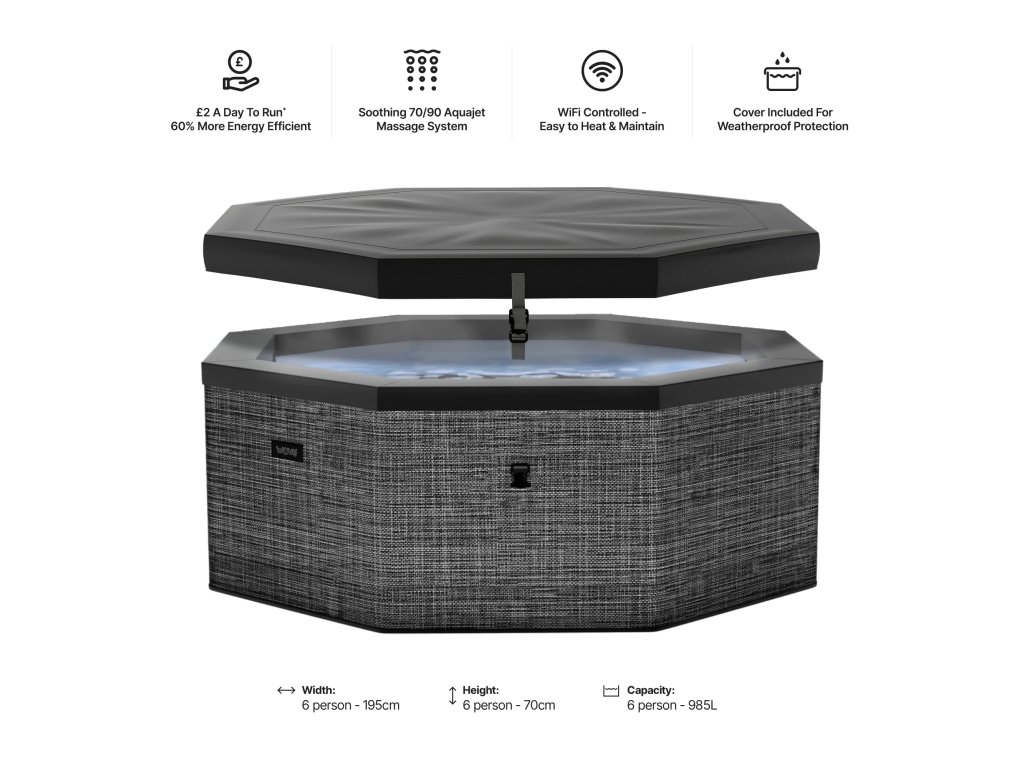 Hledáte vířivku, která kombinuje komfort pevné konstrukce, jednoduchou instalaci a nízké provozní náklady? Wave COMO 6 Flint Grey je přesně takové řešení. Díky unikátnípěnové konstrukci (Foam Spa)nabízí výrazně vyšší stabilitu než běžné nafukovací vířivky. Pevné stěny drží tvar, lépe izolují teplo a zajišťují maximální komfort při každém použití.Vířivka je navržena až pro6 osob, takže si ji užijete s rodinou i přáteli. O perfektní relaxaci se stará90 vzduchových trysek, které vytváří intenzivní bublinkovou masáž po celém těle.Integrovaný ohřev umožňuje nastavení teploty až na40 °C, přičemž systém automaticky udržuje nastavenou teplotu. Díky chytré funkciFreeze Protectse vířivka sama zapne při poklesu teploty a zabrání zamrznutí vody.Velkou výhodou je takéWiFi ovládání, díky kterému můžete vířivku ovládat odkudkoliv – nastavíte teplotu ještě před příchodem domů.Instalace je rychlá a jednoduchá – bez nutnosti stavebních úprav. Stačí rovný povrch, připojení k elektřině a voda. Wave COMO 6 je ideální volbou pro každého, kdo chce luxusní relaxaci bez složité instalace a vysokých nákladů.Klíčové vlastnosti produktuPěnová konstrukce (vyšší izolace a stabilita). Integrovaný ohřev a filtrace Automatická regulace teploty WiFi ovládání Funkce Freeze Protect proti zamrznutí Vzduchový masážní systém (90 trysek) Snadná instalace bez nářadí Energeticky úsporný provoz5 vychytávek pro zákazníkyOvládání přes mobil – zapni vířivku odkudkoliv Automatické vypnutí bublinek – ochrana systému proti přehřátí Dětský zámek ovládání – bezpečné používání Rychlé složení a uskladnění mimo sezónu Kompatibilita s LED osvětlením (možnost dokoupení) 5 důvodů, proč je Wave lepší než konkurenceFoam technologie – pevnější než běžné nafukovací vířivky Nižší energetická náročnost díky izolaci Kvalitní konstrukce + delší životnost Chytré funkce (WiFi, Freeze Protect) Silnější masážní výkon (více trysek než standard)Technické parametryModel: COMO 6 Tvar: osmiúhelník Počet osob: 4–6 Objem vody: cca 985 l Rozměry: 195 × 195 × 70 cm Vnitřní rozměry: 171 × 171 × 70 cm Počet trysek: 90 Max. teplota: 40 °C Výkon ohřevu: 1800 W Výkon čerpadla vzuchu: 600 W Průtok filtrace: cca 1325 l/h Hmotnost: cca 38,5 kg Hmotnost vč. vody: cca 1024 kg Napětí: 220–240 V 50Hz 12AObsah baleníVířivka (vnitřní + vnější plášť) Pěnové panely konstrukce Topná jednotka s ovládáním Nafukovací víko + kryt Filtrační kartuše (2 ks) Kryty filtrů Hadice a konektory Opravná sada Podložka (izolační pěna) WiFi ovladač Proč nakupovat u CF GROUP Nákup vířivky není jen o produktu – je to o jistotě. CF GROUP je specialista na bazény a wellness technologie, který vám zajistí:Odborné poradenství před nákupem Garanci originálních produktů Servis a dostupnost náhradních dílů Podporu při instalaci i provozu Dlouhodobou jistotu a bezpečí investiceU vířivky, která pracuje s vodou, elektřinou a tlakem, je kvalitní prodejce naprosto zásadní.Doplňkové parametry