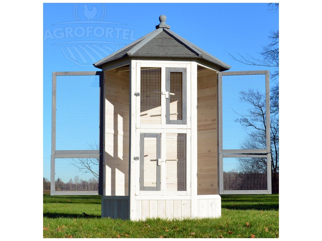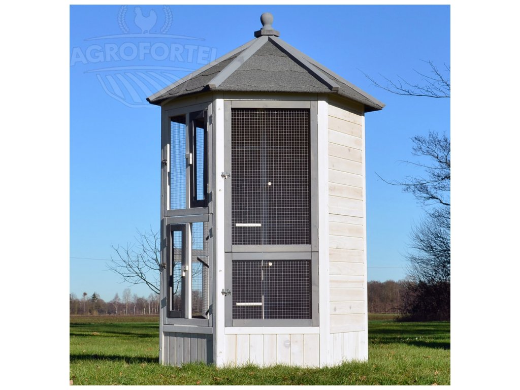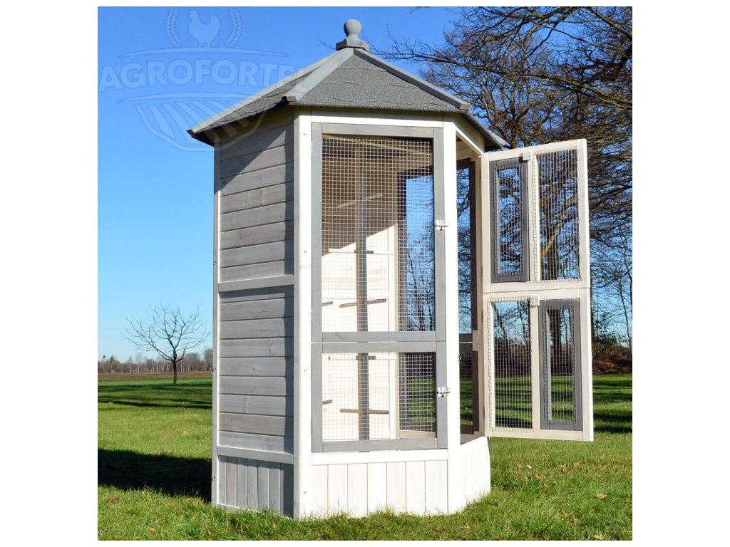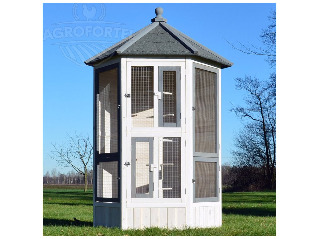 Údržba a čištění voliéry jsou díky čtyřem dveřím velmi snadné. Tyto dveře umožňují rychlý přístup k vnitřku voliéry, což usnadňuje krmení ptáků a čištění jejich prostoru. Praktické rozmístění dveří zajišťuje, že každá část voliéry je snadno dostupná.