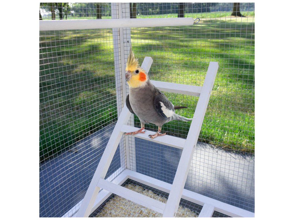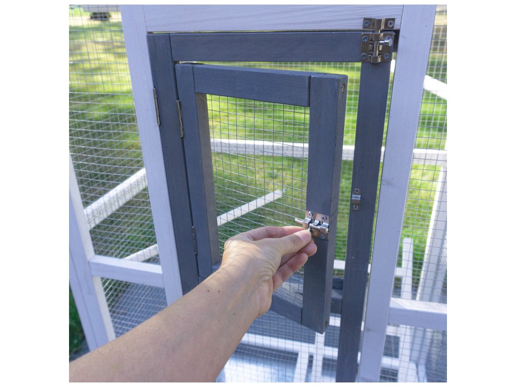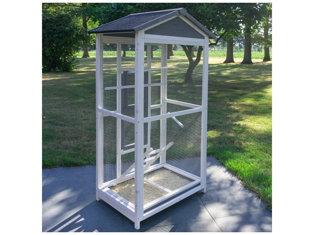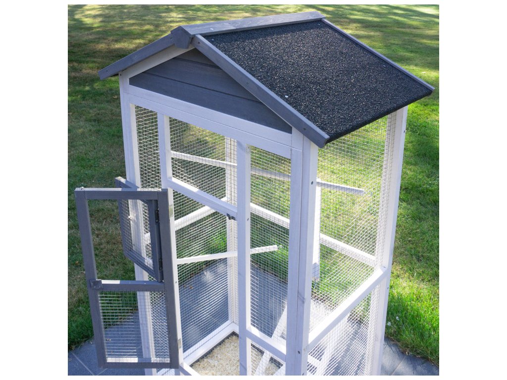Střecha je pokryta asfaltem, což zajišťuje spolehlivou ochranu proti povětrnostním vlivům. Součástí dodávky jsou tři bidýlka, která lze jednotlivě umístit do voliéry podle potřeby. Ptáci na nich mohou relaxovat a spát. Malý žebřík jim umožňuje snadný výstup a sestup. Ve spodní části voliéry je integrována zásuvka na trus, která je vyjímatelná a usnadňuje tak čištění. Přístup k čištění a krmení je zajištěn pomocí dvou dveří, což usnadňuje péči o ptáky a zajišťuje pohodlný přístup do voliéry. Montáž je velmi jednoduchá díky přiloženému obrázkovému návodu a zvládne ji opravdu každý.