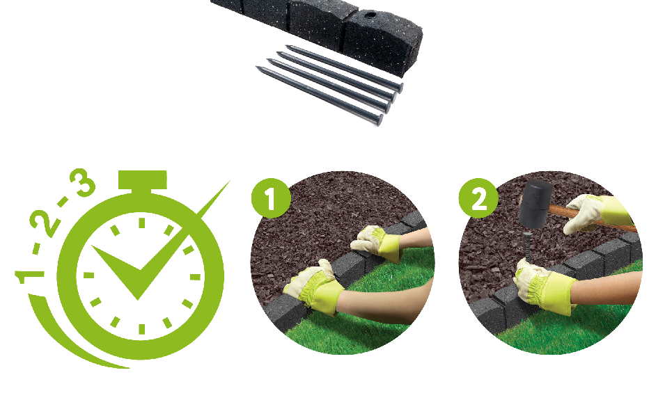 Lemy můžete instalovat zároveň s terénem nebo nechat jejich část vyčnívat. Před položením lemů, je vhodné plochu, kterou budete lemovat obrýt. Přerušíte tak kořeny rostlin, které by mohli podrůstat pod lemy a zároveň si vyznačíte prostor, kam budete lemy pokládat a jak je budete tvarovat. Každý lem má délku 120 cm a 4 otvory pro upevňovací kolíky. Kolík vložte do otvoru a zatlačte jej do půdy tak, aby nevyčníval z lemu. Pokud lem tvarujete, dávejte kolíky postupně od kraje, aby se vám lem lépe ohýbal.