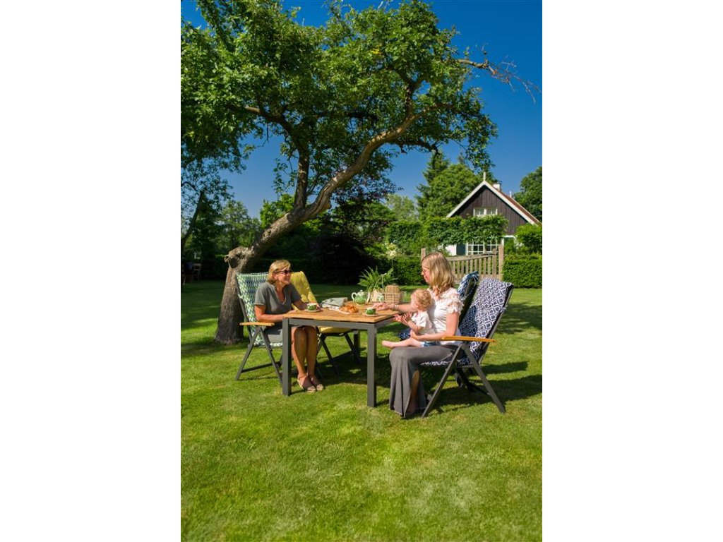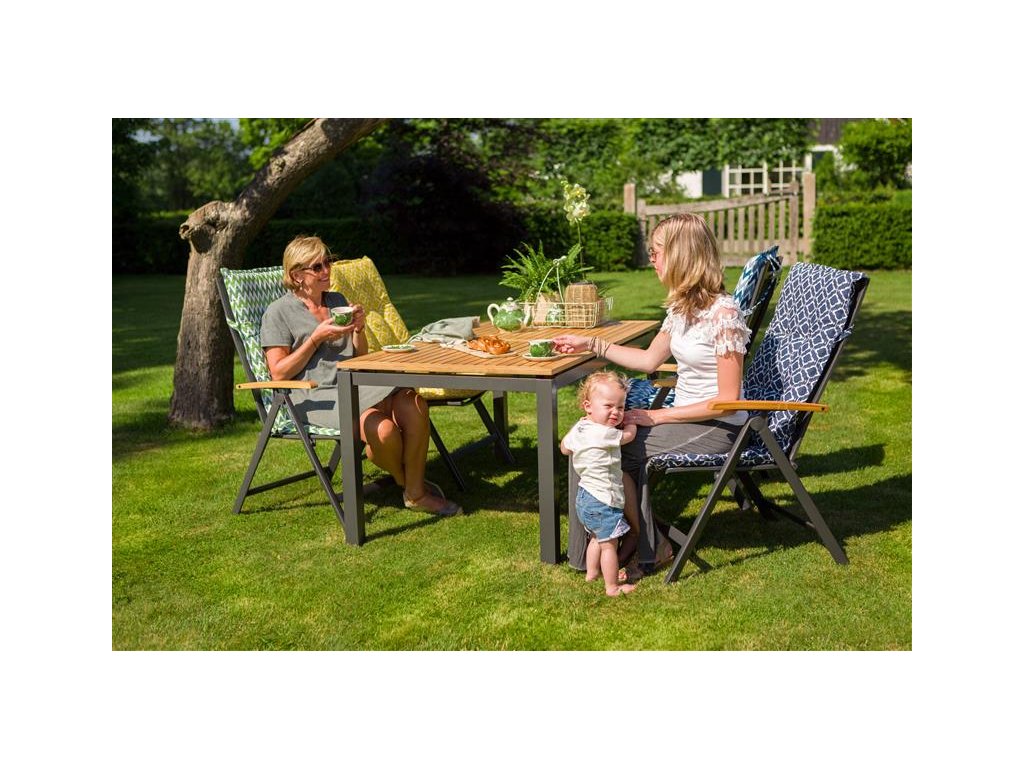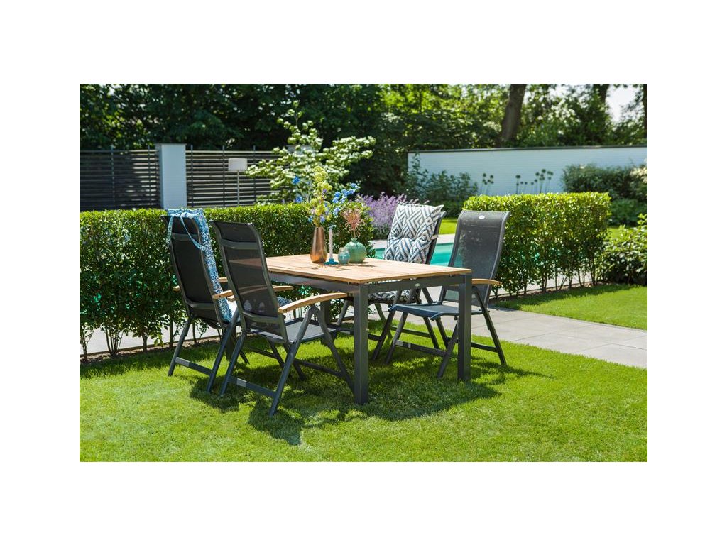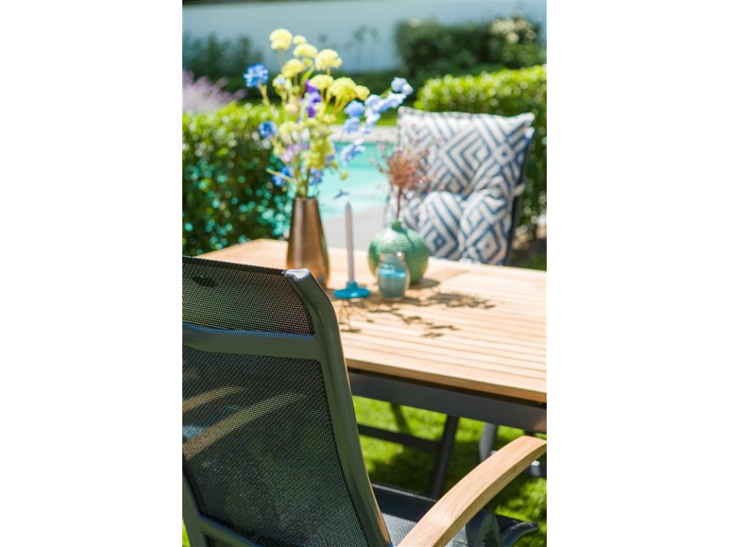 Stůl je vyroben z hliníkové robustní základny s teakovou stolovou deskou. Oba materiály jsou nenáročné na údržbu. Hliník a teak ve směsi! Teaková deska dodává stolu přirozený vzhled. Tyto materiály jsou také velmi odolné vůči různým povětrnostním vlivům a nepřízni počasí. Díky tomu může stůl zůstat venku po celý rok.
