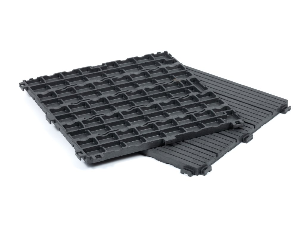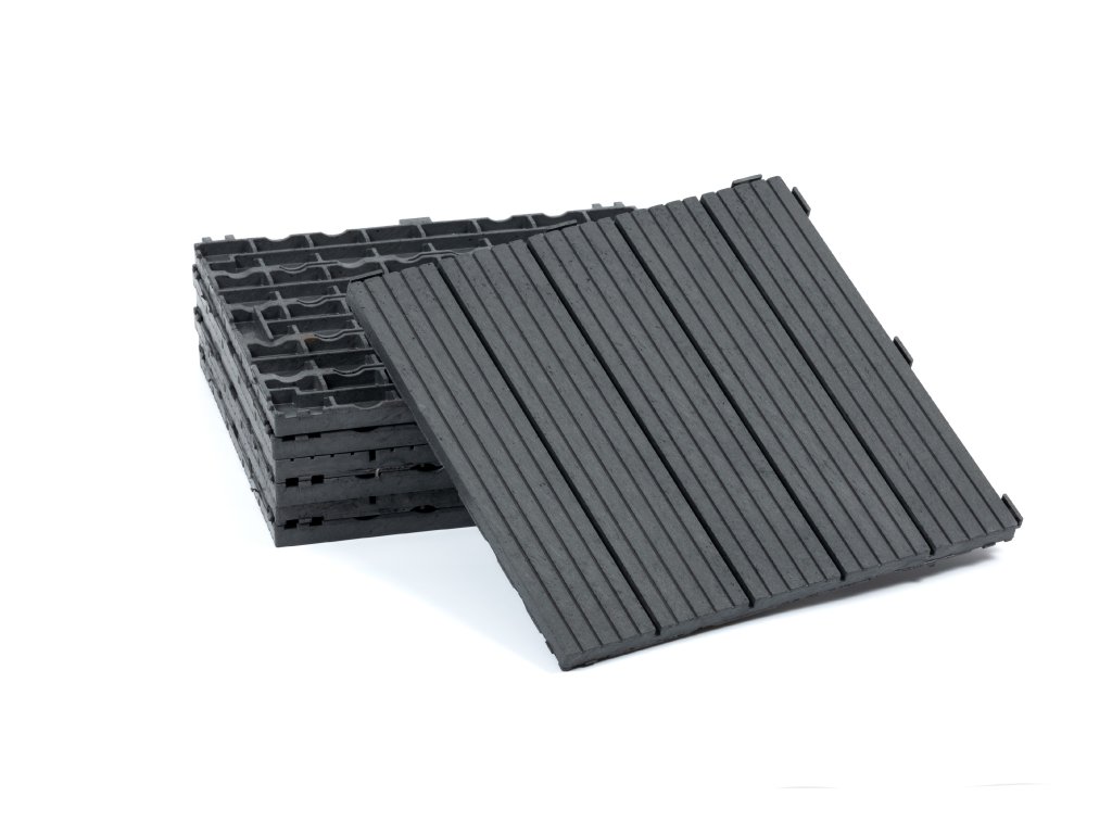 Všechny dlaždice Multy Home se vyrábí ze směsi recyklovaných pneumatik a recyklovaného polypropylenu.