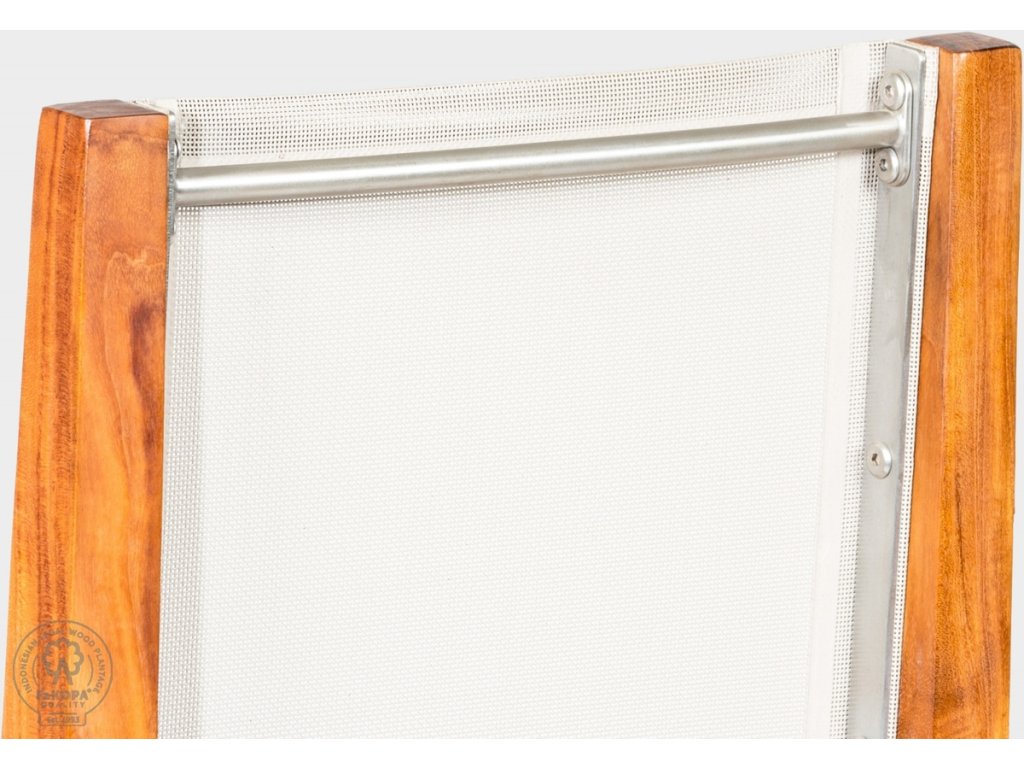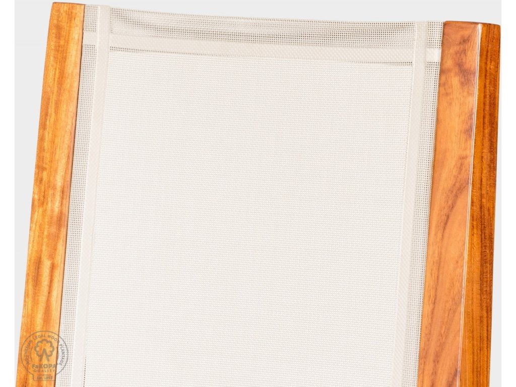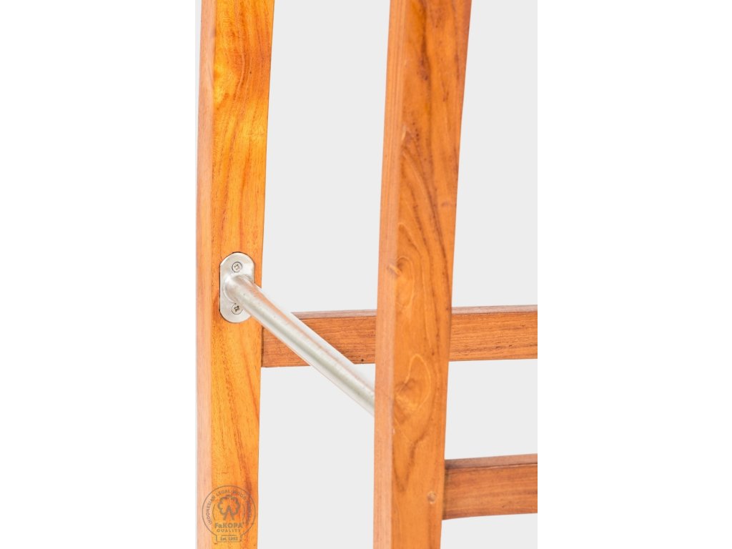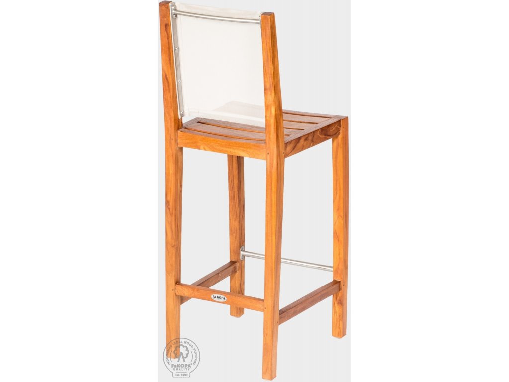 Masivní barová židle Mery o výšce 115, šířce 43 a hloubce / délce 43 cm je díky zesílené konstrukci a čepovým spojům velice pevná a stabilní. Opěrka židle je vyplněna speciální tkaninou batyline. Batyline je výjimečná, velice pevná, tvarově stálá technická tkanina, která neabsorbuje okolní teplotu či vlhkost a odolává UV záření. Nohy židle jsou chráněny plastovými krytkami. Židle je ošetřena teakovým olejem.