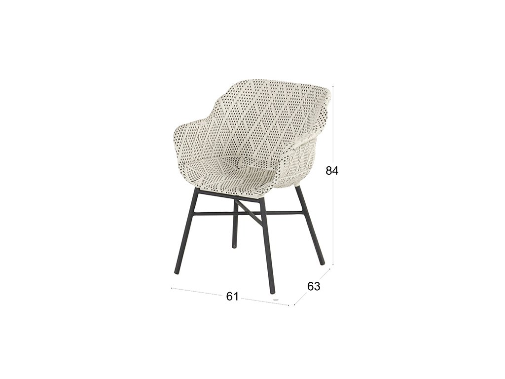 Konstrukce zahradního jídelního křesla Hartman Delphine je hliníková, tudíž nekoroduje. Je pevná, velmi stabilní a bezúdržbová. Umělý ratan je v barevném provedení černobílá a na rozdíl od přírodního ratanu odolá povětrnostním vlivům, UV-záření, chloru i slané vodě.