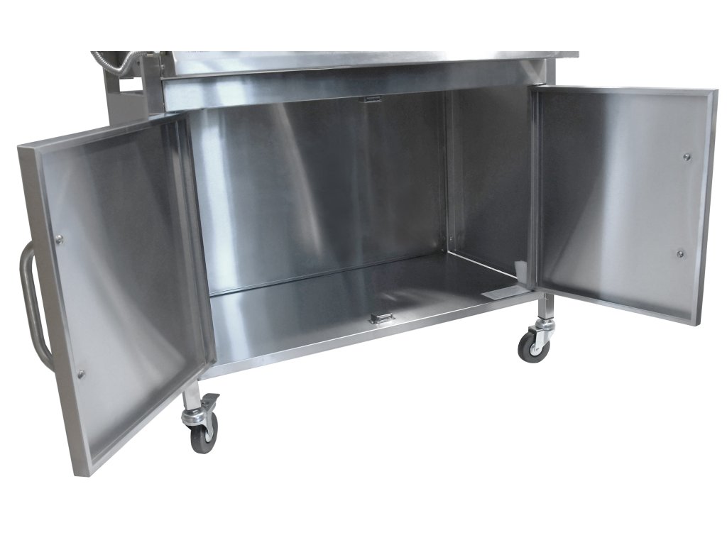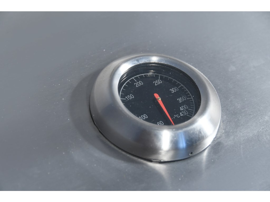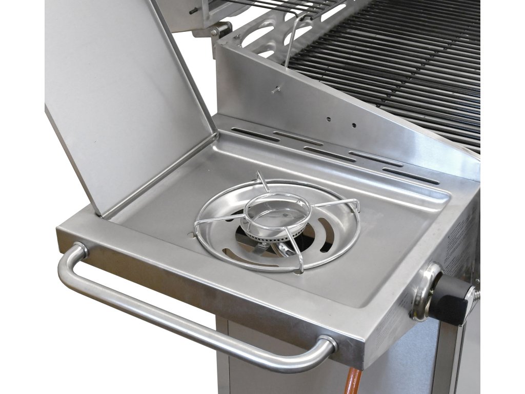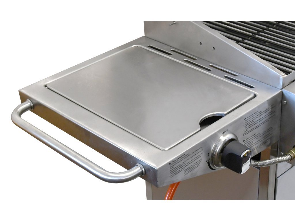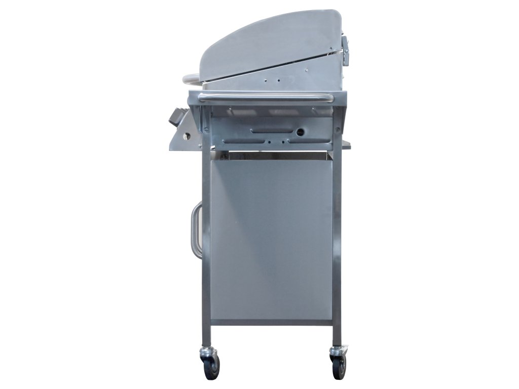 Gril je pojízdný (4 kolečka z toho 2 bržděná), osazen sklopným víkem s teploměrem a odkládací poličkou na příslušenství. Dále je doplněn bočním vařičem se samostatnou regulací a piezo zapalováním. Ve střední části je objemná, uzavíratelná skříňka s dvířky.