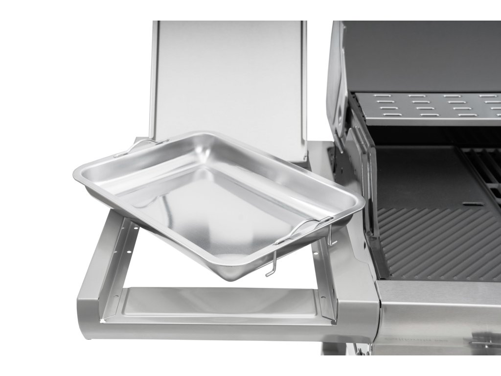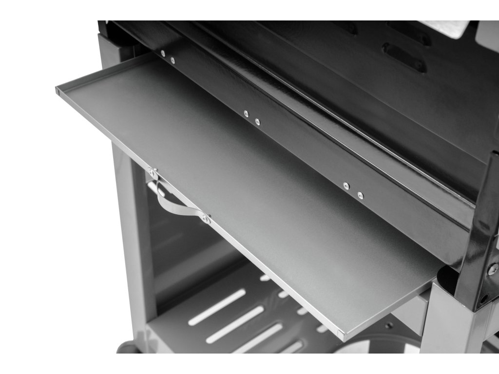 Pro odkládání věcí vám poslouží odkládací poličky, které jsou umístěny na obou stranách. Pod levou odkládací plochou je umístěna nádobka, kam můžete odkládat např. naložené maso připravené ke grilování.