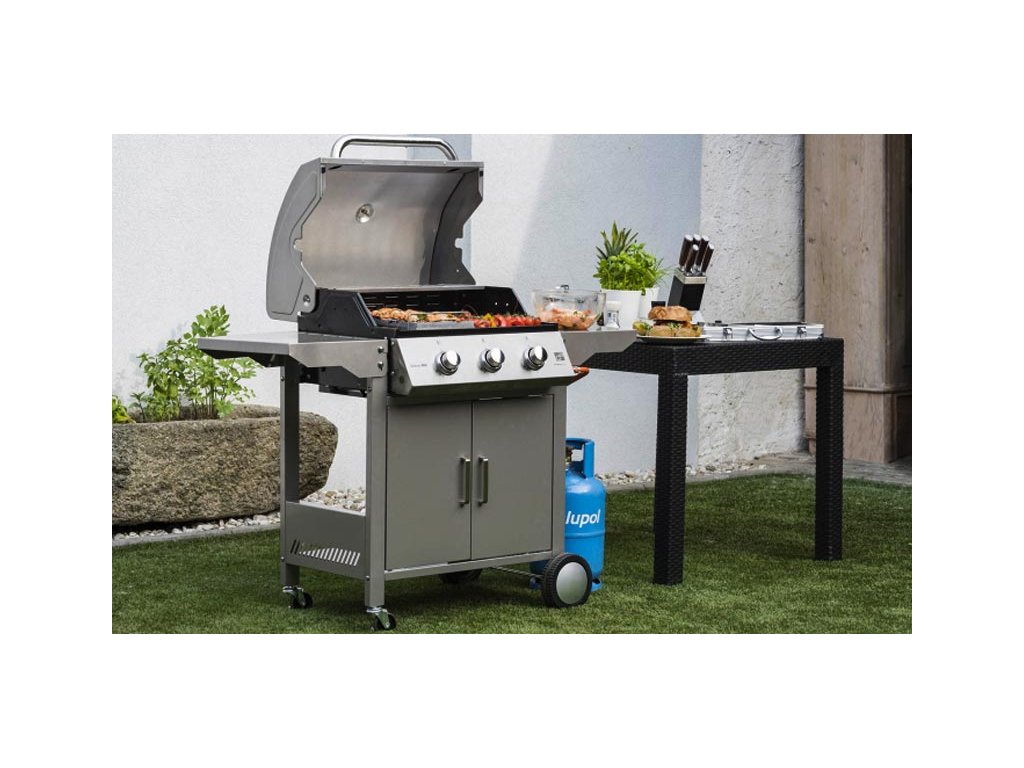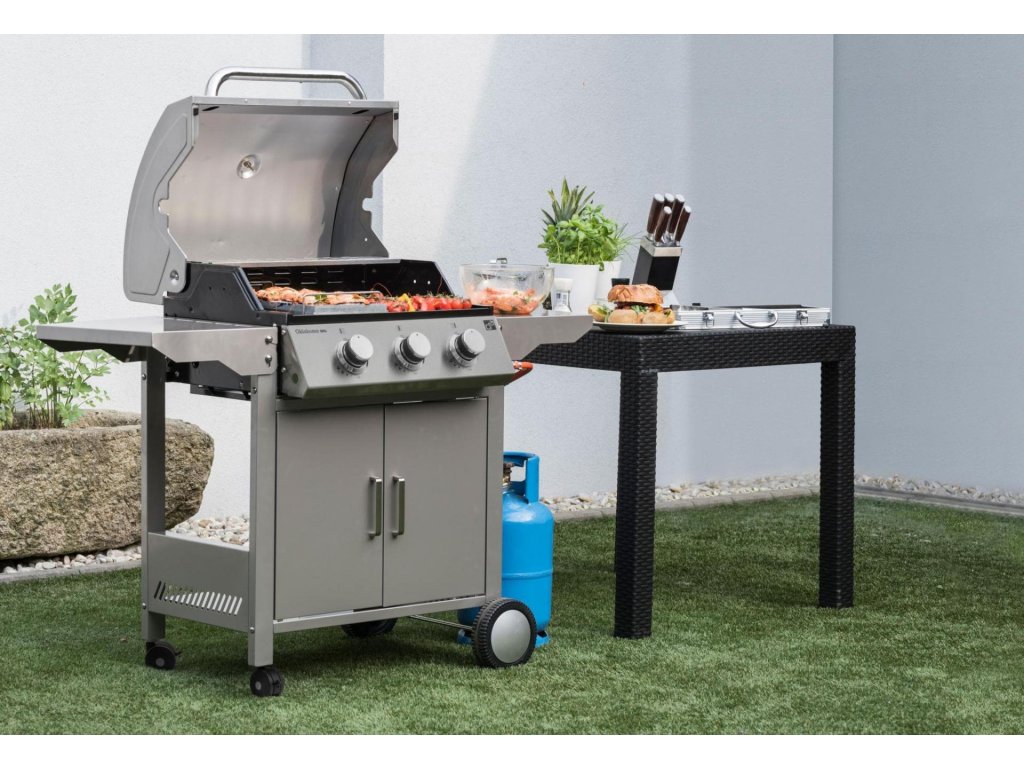 Gril disponuje třemi hořáky s elektronickým zapalování. Je vybavený litinovým roštem a litinovým plátem.