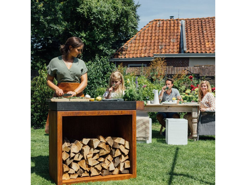 Pracovní deska z keramiky je odolná a lze ji ponechat venku trvale, zatímco teaková pracovní deska je vhodnější k ukládání na suchém místě a vyžaduje pravidelnou údržbu olejem vhodným pro kontakt s potravinami. Pracovní stůl OFYR je vybaven praktickou přihrádkou na koření a kuchyňské náčiní, která vám umožní mít veškeré potřebné ingredience při ruce během vašeho grilování. Přihrádku na nástroje lze namontovat buď na bok nebo na zadní stěnu, což zajišťuje praktickou organizaci vašeho grilovacího prostoru.