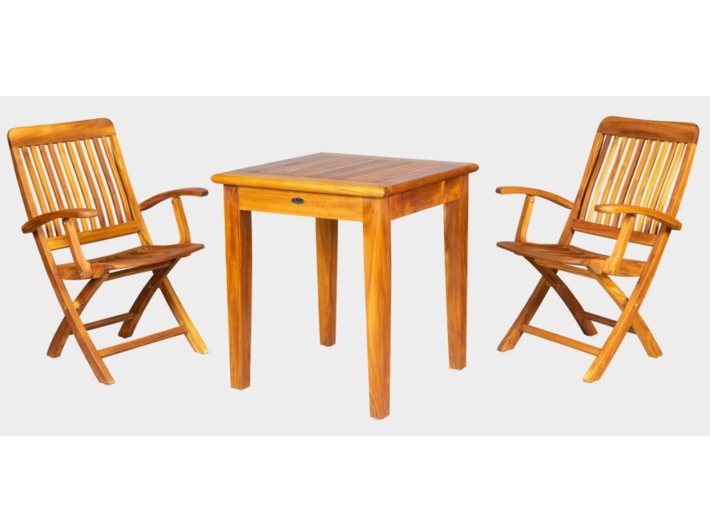 Sestava se skládá ze stolku Dante a 2 křesel Angelo. Pevný stolek Dante o rozměrech 70 x 70 cm a výšce 78 cm je vyrobený z kvalitního indonéského teaku. Špičkové provedení spojů, švédská nerezová spona, fixace jednotlivých lamel a rybinový zámek zajišťují maximální stabilitu. Deska stolu má tloušťku 3,5 cm. Nohy stolu jsou chráněny plastovými krytkami. Skládací křeslo Angelo o rozměrech 60 x 58 cm a výšce 92 cm nabízí díky anatomicky tvarovanému opěradlu a područkám dokonalé posezení. Toto zahradní křeslo má moderní design, jednoduše se skládá a proto je ideální do menších prostor. Nábytek je ošetřen teakovým olejem.
