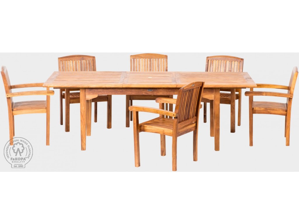 Sestava se skládá z rozkládacího stolu Elegante a 6 křesel Paris. Nábytek je ošetřen teakovým olejem.