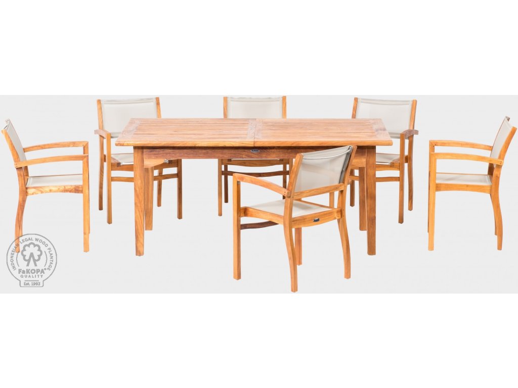 Sestava se skládá z rozkládacího stolu Elegante a 6 křesel Roma s batyline výpletem. Nábytek je ošetřen teakovým olejem.