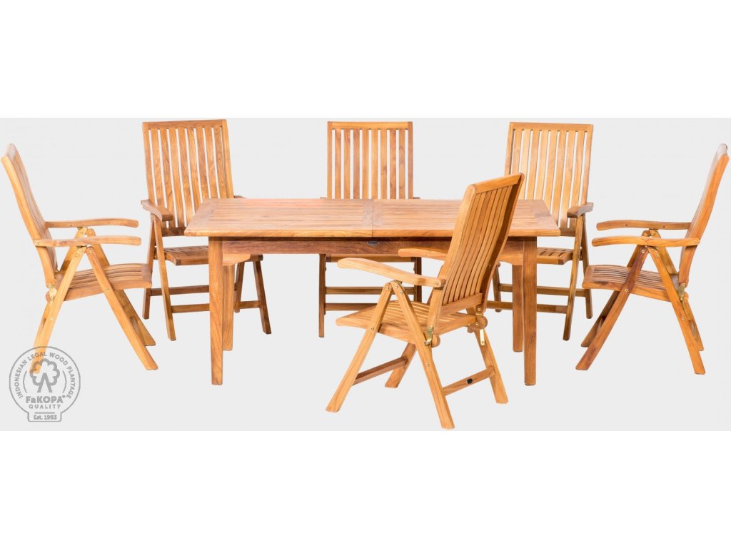Sestava se skládá z rozkládacího stolu Elegante a 6 polohovacích křesel Riva. Nábytek je ošetřen teakovým olejem.