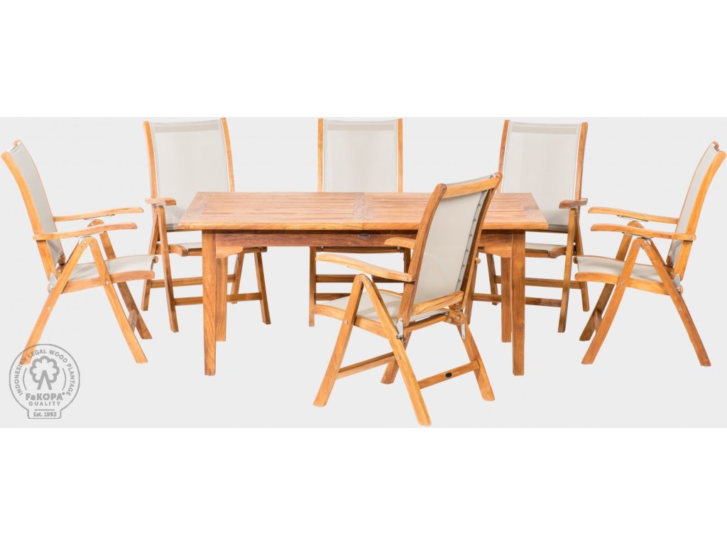 Sestava se skládá z rozkládacího stolu Elegante a 6 polohovacích křesel Diva s batyline výpletem. Nábytek je ošetřen teakovým olejem.
