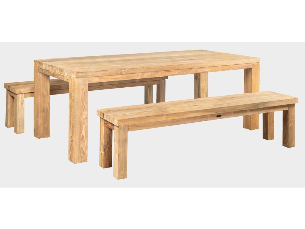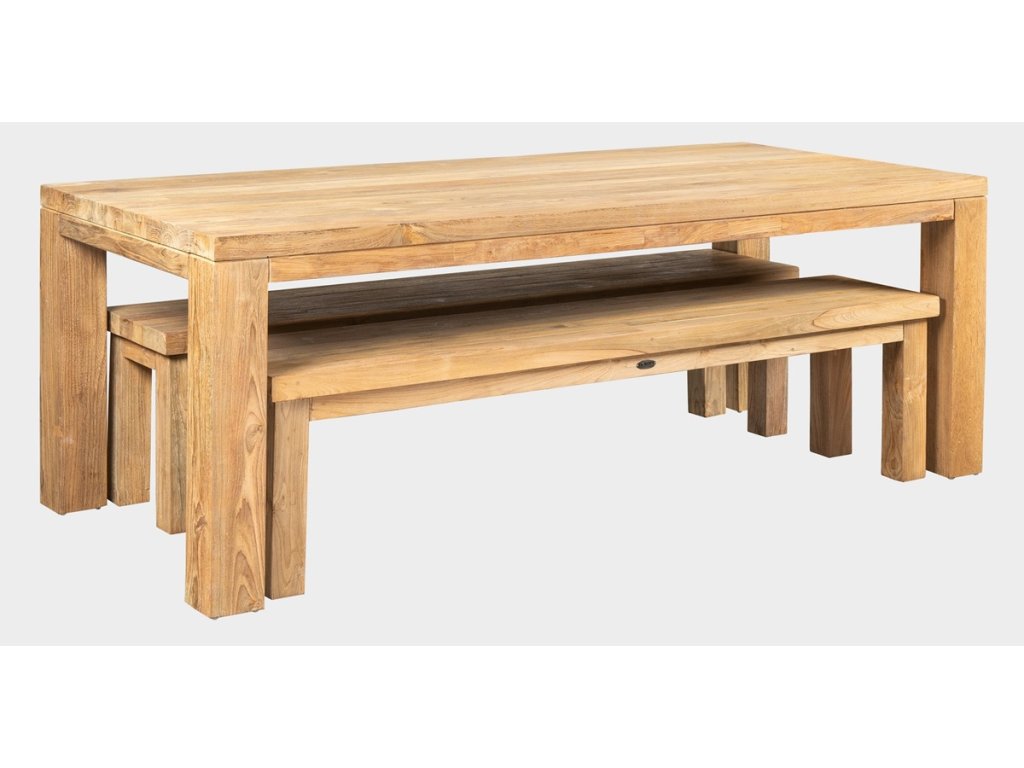 Sestava se skládá z masivního stolu a 2 masivních lavic Floss. Masivní stůl Floss Recycle o rozměrech 220 x 100 cm a výšce 78 cm je vyroben z kvalitního recyklovaného indonéského teaku. Masivní lavice Floss Recycle se spárou o délce 190 cm je vyrobena z kvalitního recyklovaného indonéského teaku. Tloušťka prken je 5 cm a nohou 8 cm.