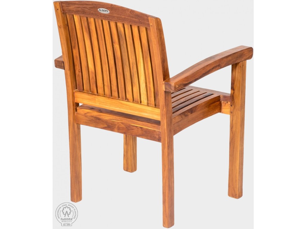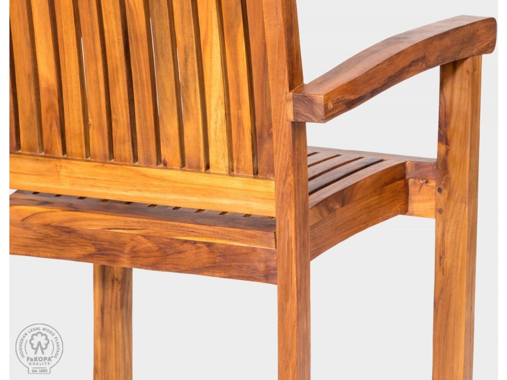 Masivní zahradní křeslo Paris o výšce 90, šířce 60 a hloubce / délce 55 cm je oblíbené nejenom svojí pevností a stabilitou, ale i pro elegantní vzhled. Na špičkové úrovni je především dílenské zpracování, pevné čepované spoje a zesílená konstrukce. Nohy jsou chráněny plastovými krytkami. Jednoduchým způsobem lze stohovat 4 zahradní křesla na sebe. Nábytek je ošetřen teakovým olejem.