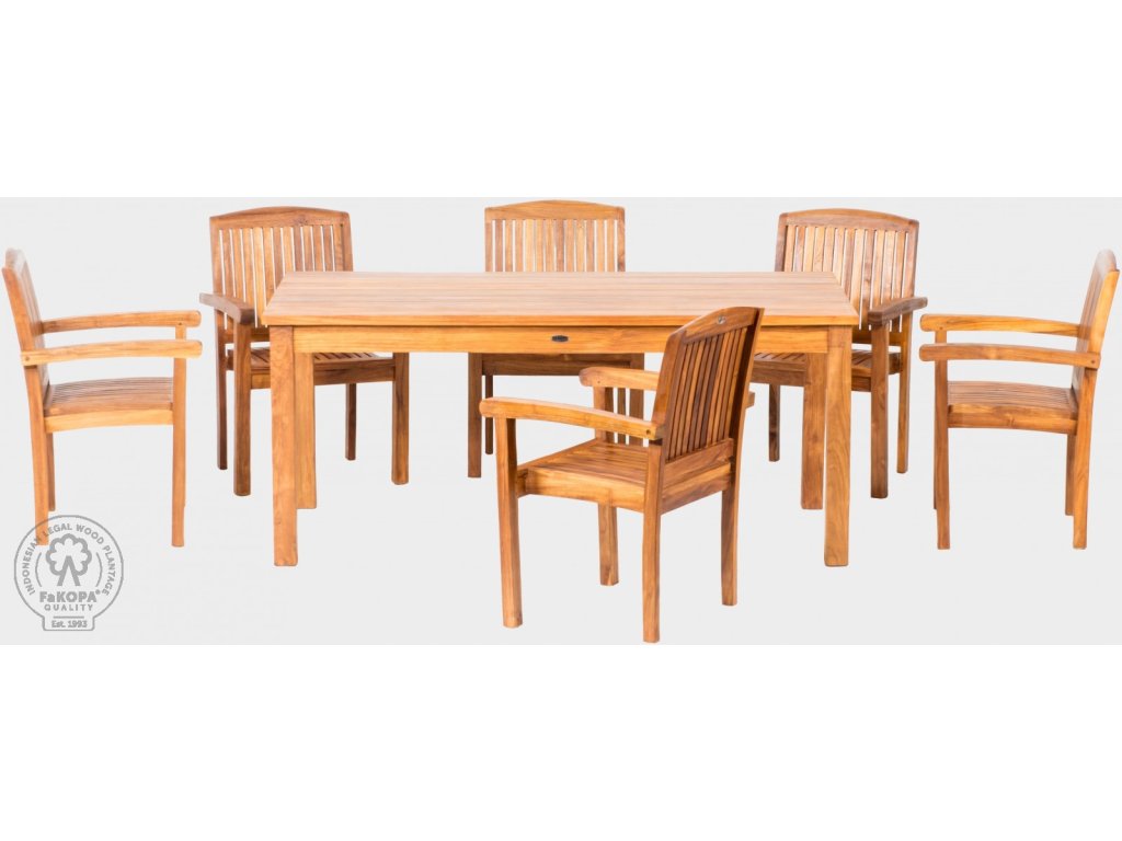 Sestava se skládá z masivního stolu Giovanni a 6 masivních křesel Paris. Masivní stůl Giovanni o rozměrech 180 x 90 cm a výšce 78 cm je vyroben z kvalitního indonéského teaku. Jedinečná kresba dělá ze stolu opravdový originál. Nohy jsou ukotveny k rámu pomocí zafrézované nerezové spony a zespoda chráněny proti oštípání plastovými krytkami.