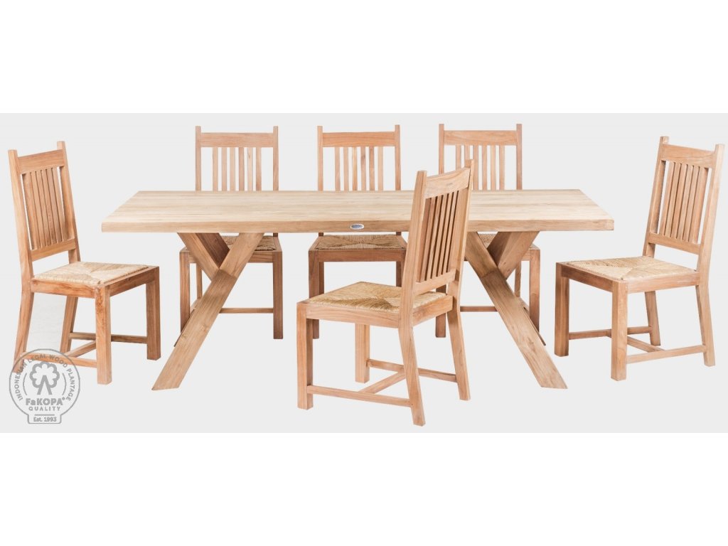 Sestava se skládá z masivního stolu Spider a 6 židlí Nanda s výpletem z mořské trávy. Masivní stůl Spider Recycle o rozměrech 200 x 100 cm a výšce 75 cm je vyroben z kvalitního recyklovaného indonéského teaku. Masivní židle Nanda o výšce 105, šířce 52 a hloubce / délce 52 cm je díky zesílené konstrukci a čepovým spojům velice pevná a stabilní. Nohy židle jsou chráněny plastovými krytkami. Sedák židle je pečlivě a dekorativně vypleten z kvalitní a velice odolné mořské trávy. Tyto židle jsou vhodné především do interiéru.