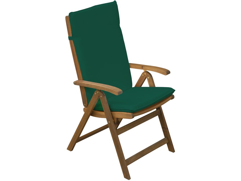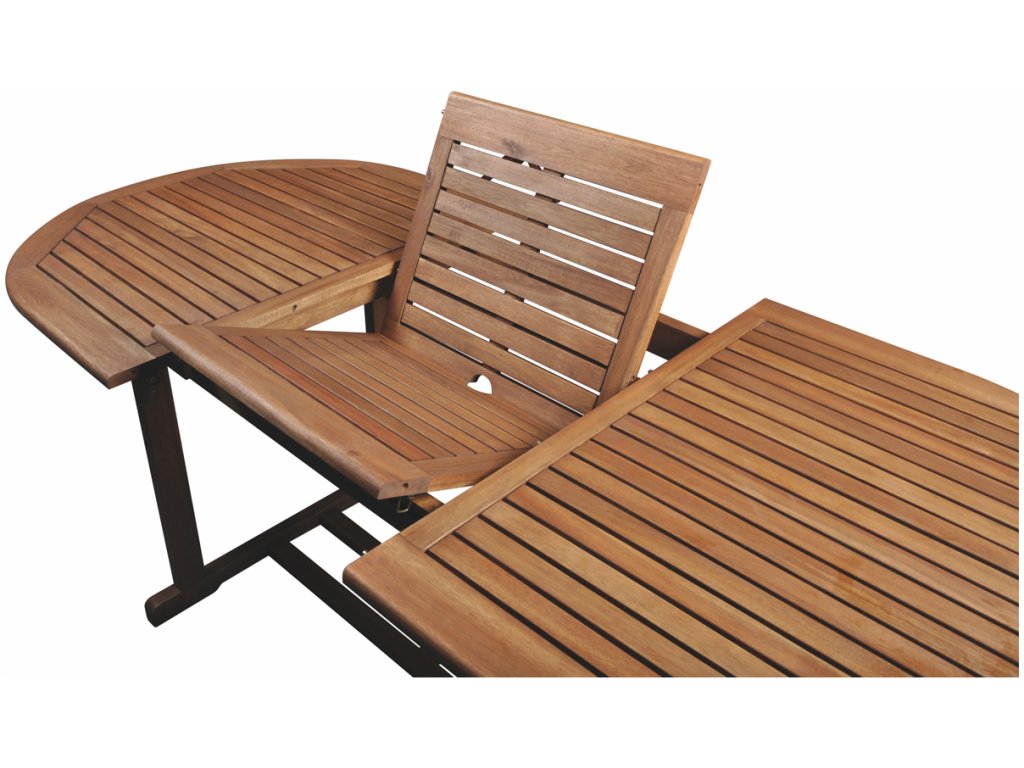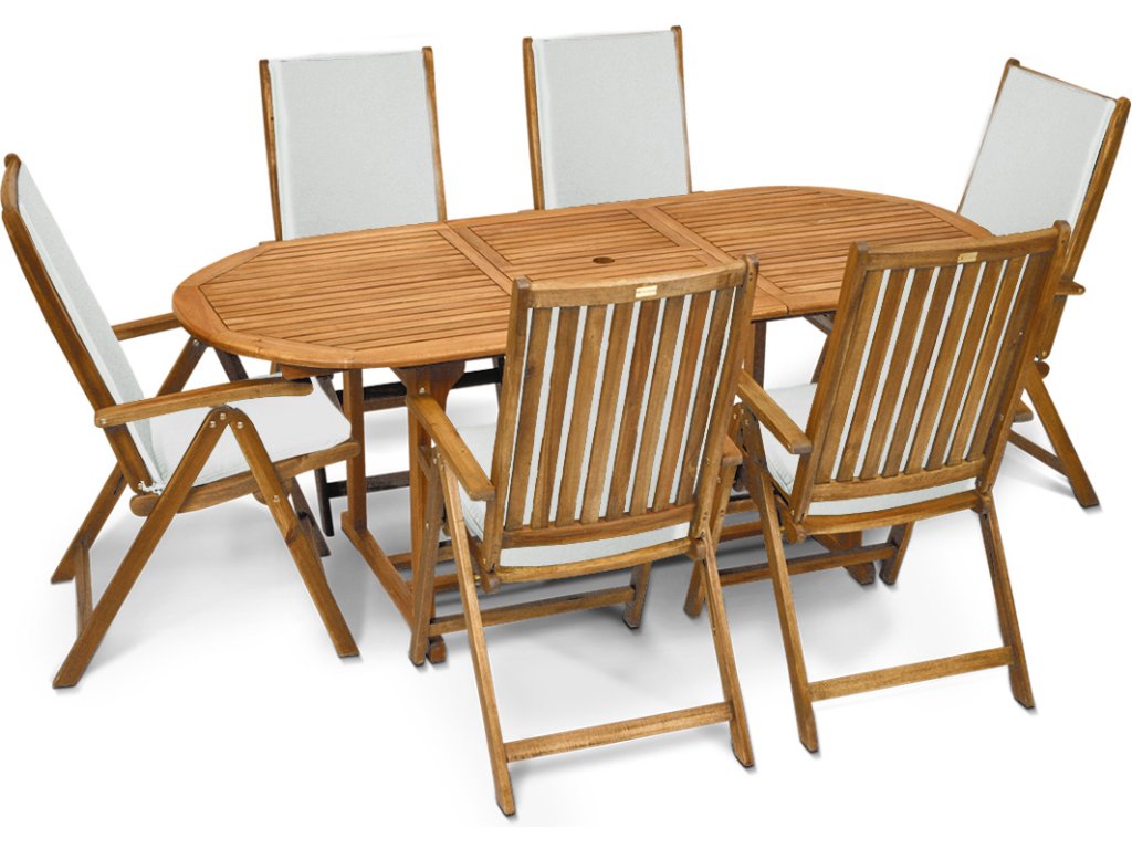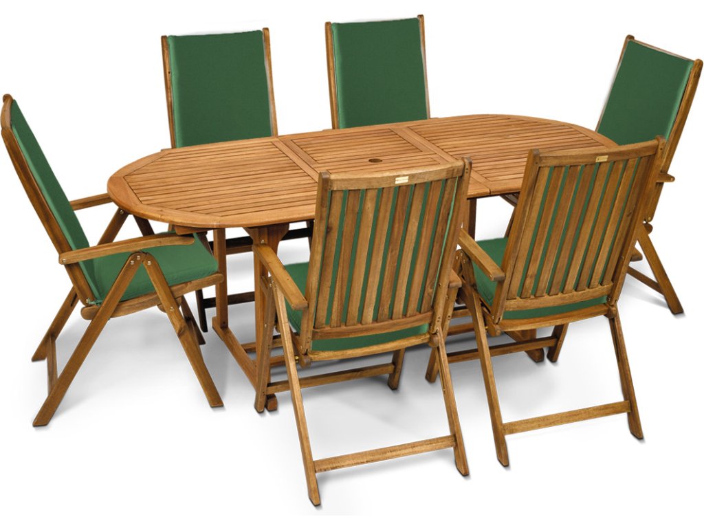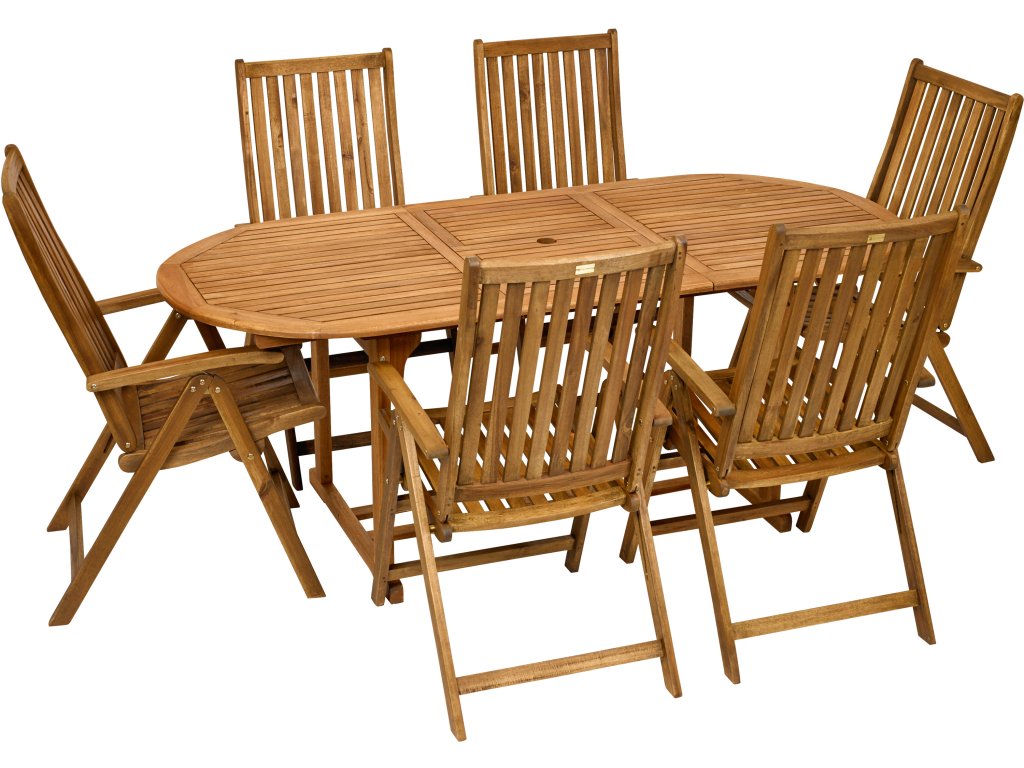 Sestava zahradního nábytku se skládá ze šesti křesel a rozkládacího stolu o rozměru 150 x 90 x 75 cm. Při rozložení stůl dosahuje délky až 200 cm. Uprostřed stolu je připravený otvor pro umístění slunečníku. Křesla jsou polohovatelná, opěradlo si můžete nastavit až do 5 různých poloh. Křesla můžete velice snadno složit a ušetřit tak místo při jejich skladování. Ke křeslům je možné dokoupit pratelné potahy v bílé nebo zelené barvě. Set je vhodný jak na venkovní tak na vnitřní použití.