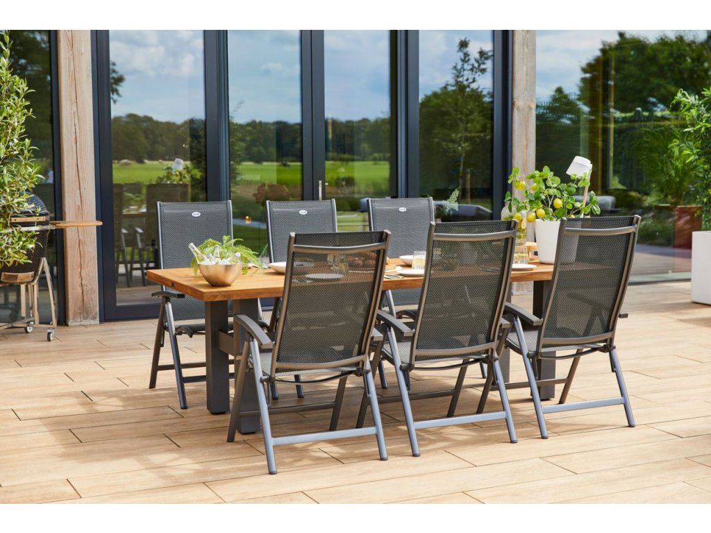 Krásný set zahradního, rozkládacího stolu CONCEPT a šesti hliníkových křesel SALVATORE s hliníkovými područkami, je ideální pro větší rodinu nebo pro neočekávané hosty. Polohovací křesla jsou velmi pohodlná a mají celkem pět poloh. Celý set je odolný vůči vnějším vlivům a je možné nechat ho venku celý rok.