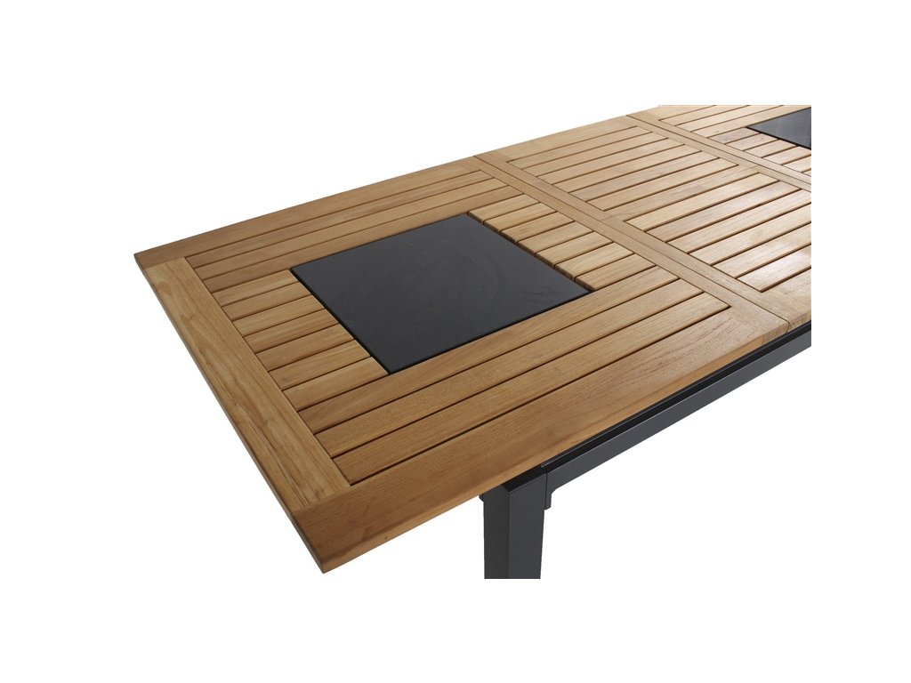 Jídelní zahradní stůl Hartman CONCEPT je tvořen robustním hliníkovým rámem s teakovou deskou, do které jsou vsazeny kamenné desky. Ty jsou nejen dekoračním prvkem, ale zároveň slouží jako odkládací plocha, která snese velmi vysoké teploty. Stůl lze kombinovat s libovolnou židlí. Stůl je rozkládací a tedy ideální pro větší počet strávníků. Teakové dřevo dodává stolu přírodní a teplý vzhled a skvěle se hodí k libovolným židlím Hartman