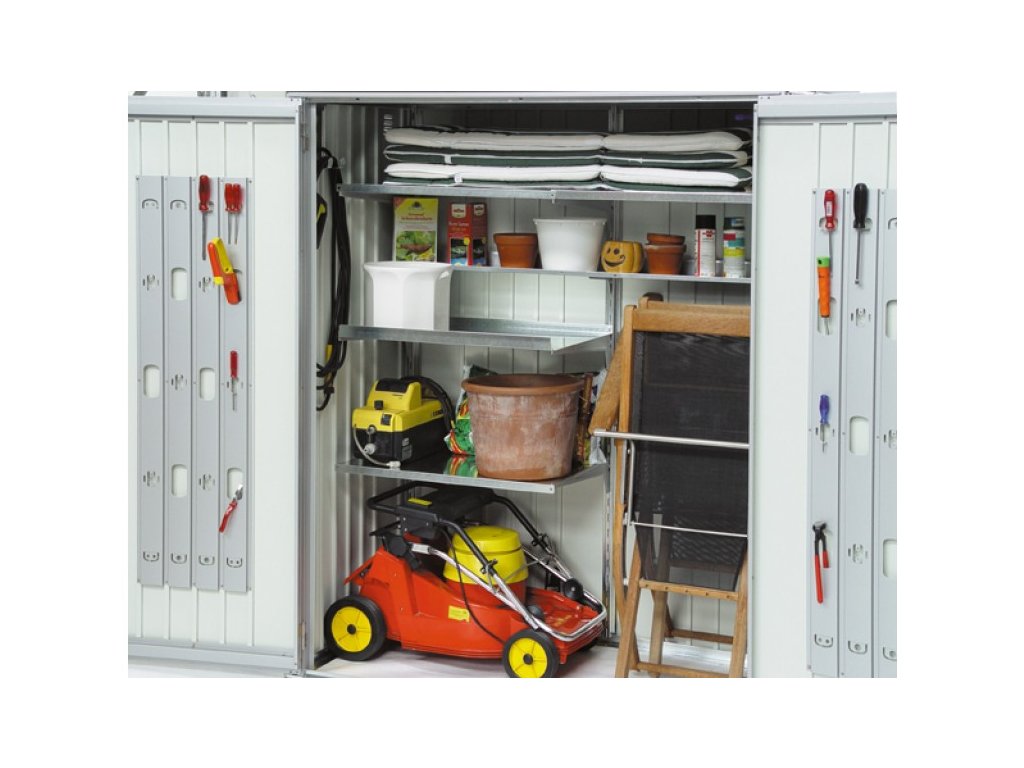 Sada polic a regálových stojen změní vaši skříň Biohort na přehledný sklad. Police jsou individuálně polohovatelné. Standardní hloubka je 24,5 cm. Šířka police je 72 cm. Policová sada je žárově pozinkovaná, aby byla zajištěna dlouhá životnost. Snadno se instaluje a vydrží zatížení až 15 kg na polici. Pro všechny, kteří potřebují uložit mnohem více věcí, nabízíme polici s hloubkou 43,5 cm, kterou si můžete dokoupit v bohaté nabídce volitelného příslušenství.