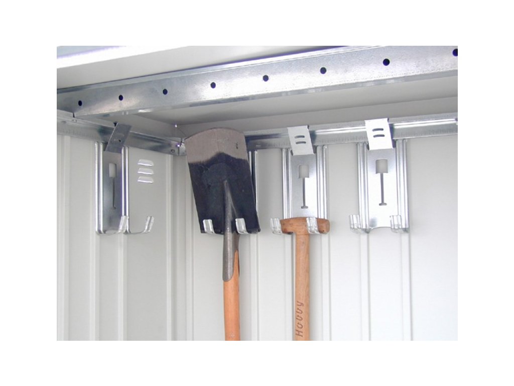 Držáky z žárově pozinkovaného ocelového plechu. Nosnost cca 10 kg. Ideální k zavěšení lopat, pilky, hrábí, zahradních hadic a dalšího zahradního nářadí. Snadná instalace, jednoduše zacvakněte na vybrané místo.