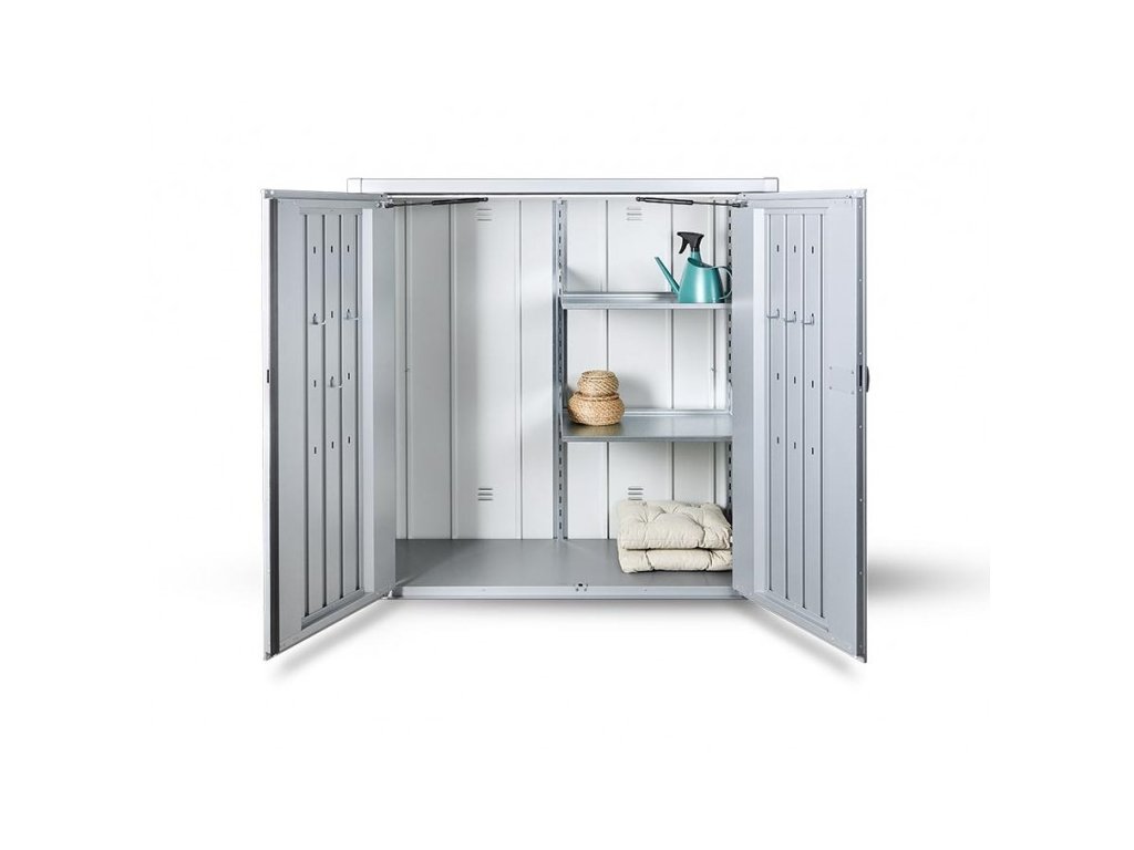 Konstrukci skříně tvoří žárově pozinkovaný ocelový plech o síle 0,5 mm, potažený polyamidovým vypalovacím lakem, šrouby a panty jsou z nerezové oceli. Tento model má dvoukřídlé dveře na pantech o šířce 103 cm a výšce 131 cm. Komfortní otevírání dveří pomocí tlakové plynové pružiny. Dveře jsou vybaveny trojnásobnou závorou s otočnou rukojetí, cylindrickým zámkem a náhradním klíčem. Skříňku tak lze bezpečně uzamknout.