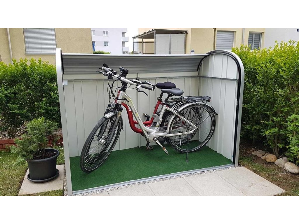 Box je absolutně odolný proti dešti, s integrovanou ventilací, uzamykatelný. Dokoupením držáku jízdních kol v nabídce volitelného příslušenství získáte bezpečnou garáž pro svá kola.