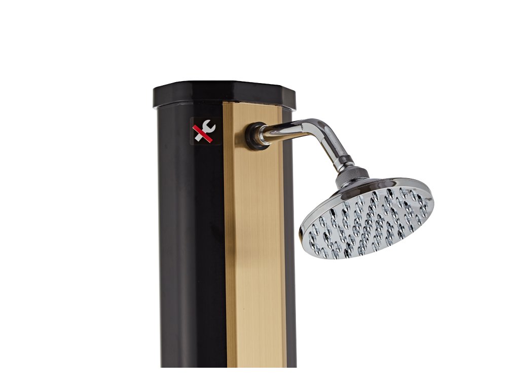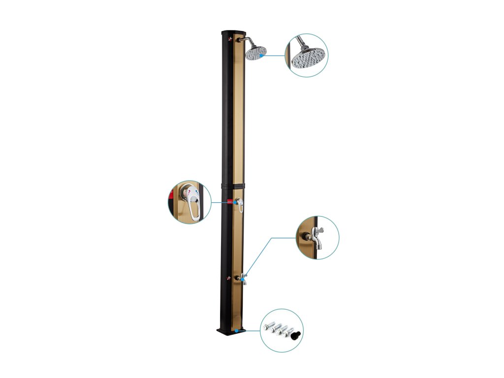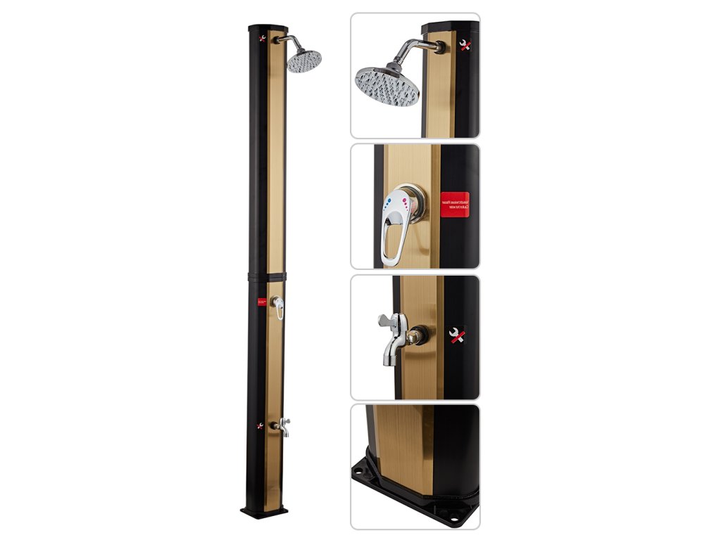 Solární sprcha NEOVA Korfu 35L – Elegantní a ekologické řešení pro vaši zahradu Solární sprcha NEOVA Korfu 35L v černo-zlatém provedení je perfektním doplňkem každé zahrady, terasy nebo okolí bazénu. Díky svému modernímu designu a ekologickému fungování bez potřeby elektřiny nabízí komfortní osvěžení a šetří náklady na energii. Tato sprcha využívá solární energii k ohřevu vody až na 60°C, což je ideální pro letní dny, kdy chcete mít k dispozici teplou vodu bez jakéhokoli zásahu do elektrické sítě. Montáž sprchy je velmi jednoduchá. Stačí vybrat slunné místo, kde bude mít sprcha dostatek přímého slunečního světla během dne, a připevnit ji k pevnému základu, například betonové nebo dřevěné desce. Po připojení vodní hadice a montáži sprchové hlavice je sprcha připravena k použití. Jakmile je sprcha napuštěná vodou, začne díky slunečnímu záření ohřívat vodu, což obvykle trvá kolem 2 hodin, v závislosti na počasí. Hlavní parametry solární sprchy NEOVA Korfu 35L:Materiál PVC odolného vůči UV + ABSPoužití k bazénu i do zahradyObjem solárního zásobníku 35 lMax. teplota vody 60°CVýška sprchy 217 cmVáha 9,5 kgVelikost sprchovací hlavice ø 15 cmVelikost základny 18 x 14,5 cmBarva černo-zlatáDvoudílná anoRegulace poměru studené a teplé vody anoKohoutek na oplach nohou anoPřipojení na zahradní hadici ano, součástí baleníKotvení kotvící šrouby, součástí balení Solární sprcha NEOVA Korfu 35L je ideální volbou pro každého, kdo hledá ekologické, úsporné a snadno instalovatelné řešení pro teplou vodu na zahradě nebo u bazénu. Díky její jednoduché montáži, minimální údržbě a modernímu vzhledu je skvělým doplňkem pro venkovní prostory. Užijte si pohodlí a osvěžení bez nutnosti elektrického napájení!Doplňkové parametry