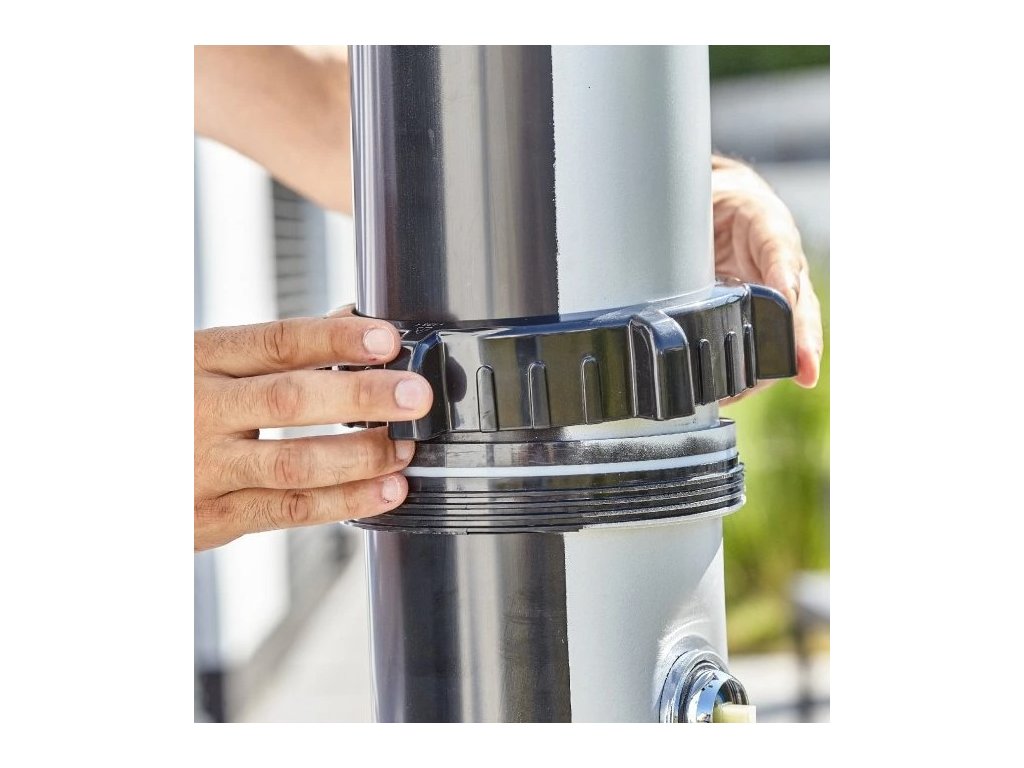 Montáž sprchy je velmi jednoduchá a zvládnete ji sami. Solární sprcha se připevní k podkladu pomocí 4 šroubů, které jsou součástí balení. Pak už stačí připevnit zahradní hadici a je to hotové. Pokud nechcete sprchu připevňovat k zemi, můžete ke sprše dokoupit podlahový podstavec a připevnit k sprchu k němu. Pokud je podstavec dostatečně velký, zajistí samonosnost sprchy a není ho potřeba více kotvit. Podstavec je praktickým doplňkem k solární sprše – je protiskluzový, bezpečný a s odtokem vody. Sprchu připevněnou k podstavci lze snadno přenést na jiné místo v zahradě.