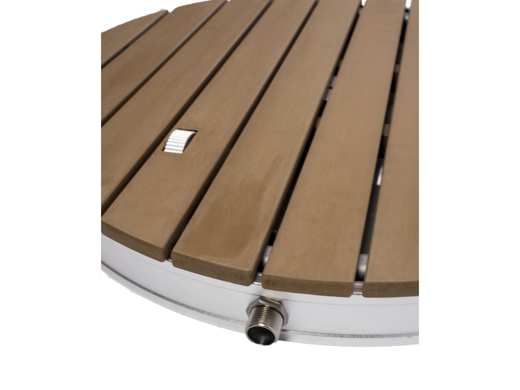 Sprchovací deska CF Sprcha, která nezkazí žádnou zábavu a budou ji milovat děti i dospělí! Sprchu zapnete otočným kolečkem, které je umístěné vroštu sprchy a nastavíte si požadovanou výšku proudu. Ten může být vysoký až 4 m! Po obvodu sprchy je umístěno 18 trysek ze kterých tryská voda do požadované výšky a dopadá na vás jako při lehkém letním deštíku. A zábava začíná! Sprcha má průměr 70 cm a je vyrobena z kvalitníhoWPC vdesignu teakového dřeva. Váha sprchy je 7 kg. Ze spodní strany má sprcha praktické madlo a lze ji tak snadno přenést kamkoliv vzahradě. Připojení sprchy na přívod vody je velmi jednoduché pomocí hadicové rychlospojky, která je součástí balení. Sprcha slouží nejen pro osvěžení, ale doporučujeme se osprchovat před každým koupáním ve vašem bazénu. Do vody se pak dostává méně nečistot, což snižuje spotřebu bazénové chemie a potřebu péče o bazén. Parametry:Materiál WPC v teakové provedeníPoužití k bazénu i do zahradyPrůměr 70 cmOvládání nožníPočet trysek 18Výška proudu až 4 mRegulace výšky proudu anoVáha 7 kgBarva teak, bíláManipulační madlo anoPřipojení na zahradní hadici ano, součástí baleníDoplňkové parametry
