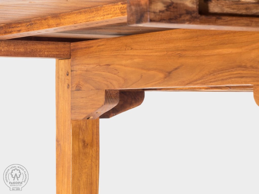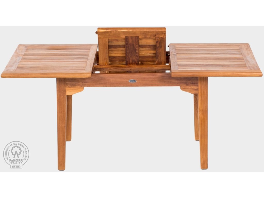 Obdélníkový rozkládací stůl Elegante má špičkově provedené spoje. Švédská nerezová spona, fixace jednotlivých lamel a rybinový zámek zajišťují maximální stabilitu. Deska zahradního stolu má tloušťku 3,5 cm. Nohy stolu jsou chráněny plastovými krytkami. Otvor pro slunečník je zakryt mosaznou zátkou. Stůl je možné ze základního rozměru 110 cm zvětšit až na rozměr 160 cm. Stůl je ošetřen teakovým olejem.