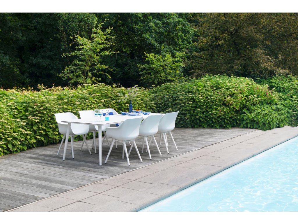 Zahradní stůl SOPHIE má moderní design a dokonale se hodí k židlím SOPHIE. Vrchní deska je vyrobena z HPL (High Pressured Laminate) a základna z hliníku. Tyto materiály lze ponechat venku po celý rok a velmi snadno se čistí.