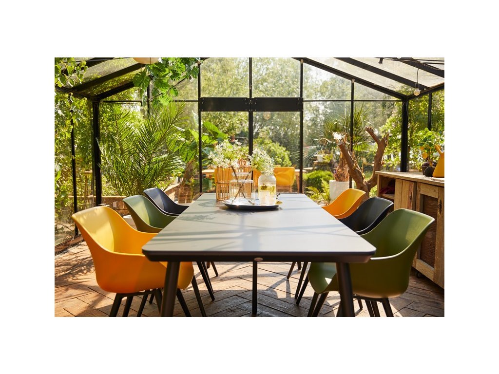 Zahradní stůl SOPHIE má moderní design a dokonale se hodí k židlím SOPHIE. Vrchní deska je vyrobena z HPL (High Pressured Laminate) a základna z hliníku. Tyto materiály lze ponechat venku po celý rok a velmi snadno se čistí.