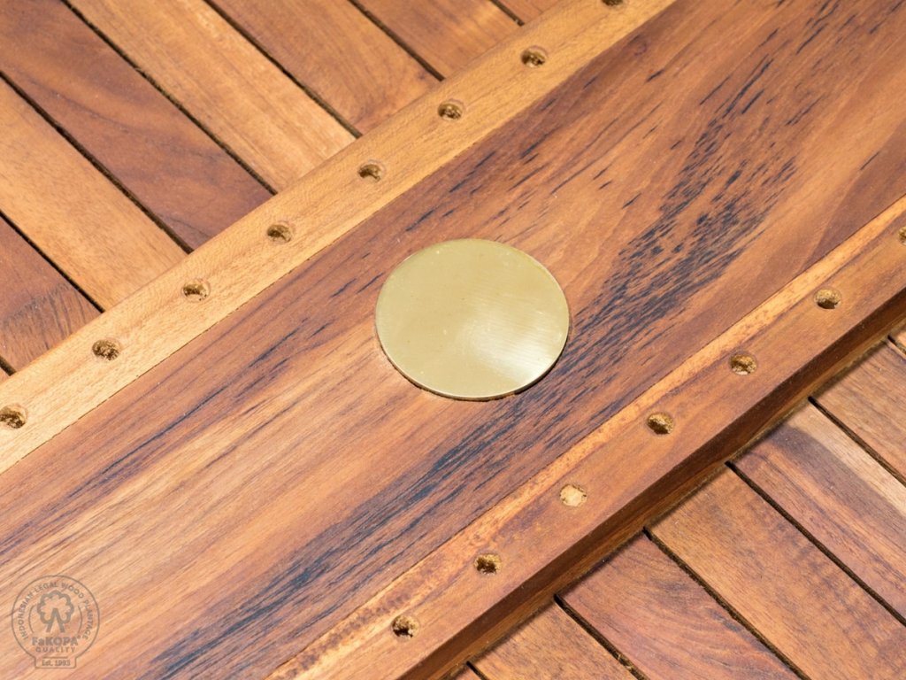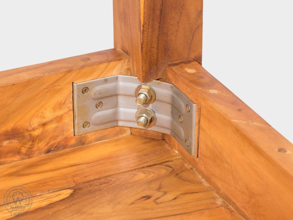 Deska stolu je velmi precizně čepovaná segmenty o síle 35 mm. Rybinové zámky a spojení mosaznými vruty zajišťují vysokou pevnost a stabilitu. Nohy stolu jsou k desce upnuty ocelovou sponou. Stůl Dante se vyznačuje velmi dlouhou životností a odolností. Je ošetřen teakovým olejem.